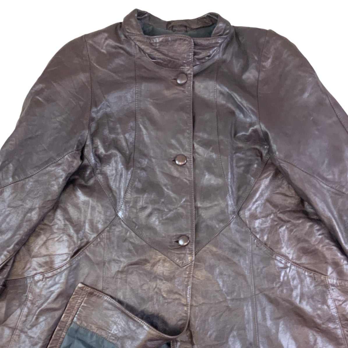 Vintage 80s Dark Brown Long Leather Swing Jacket Coat M 14 16