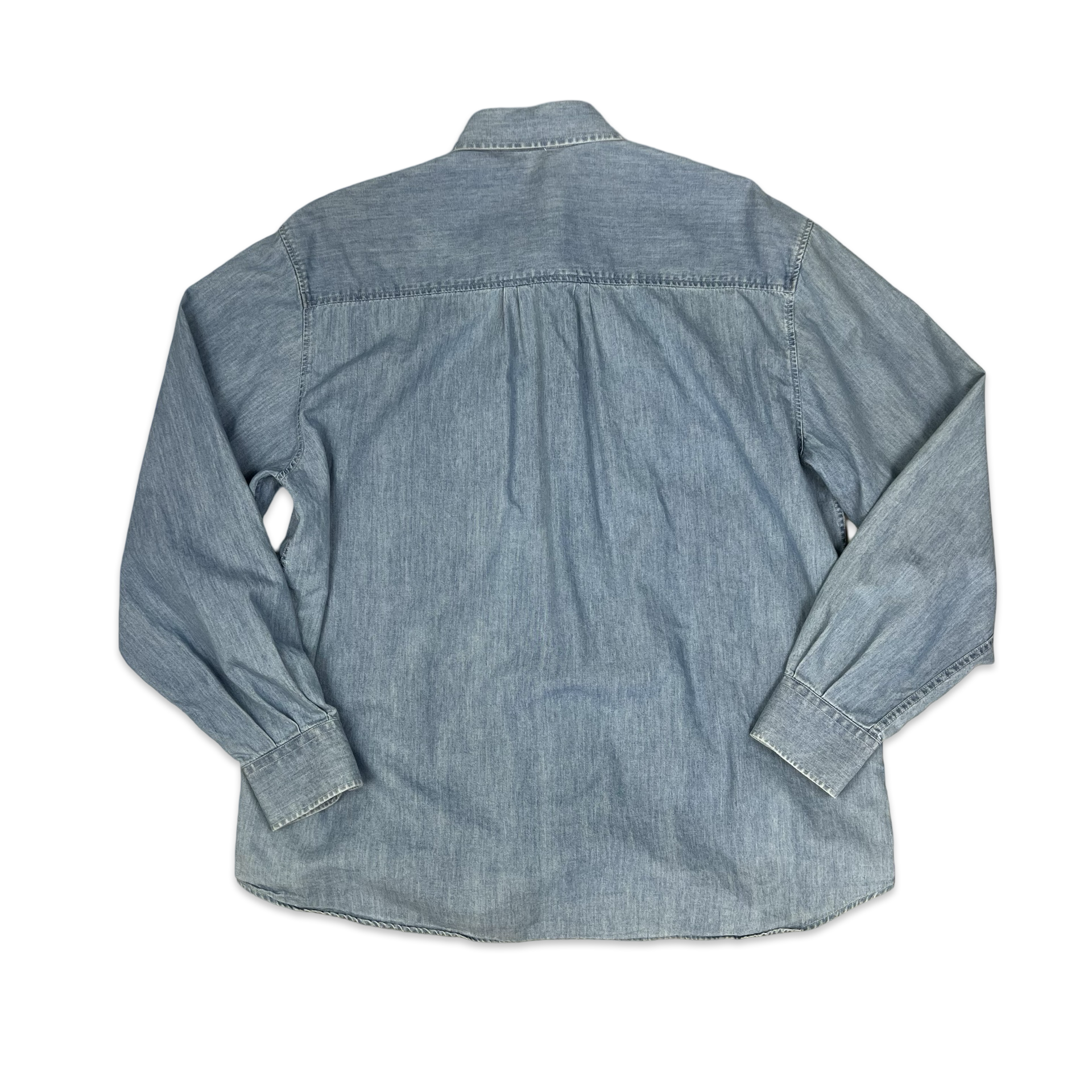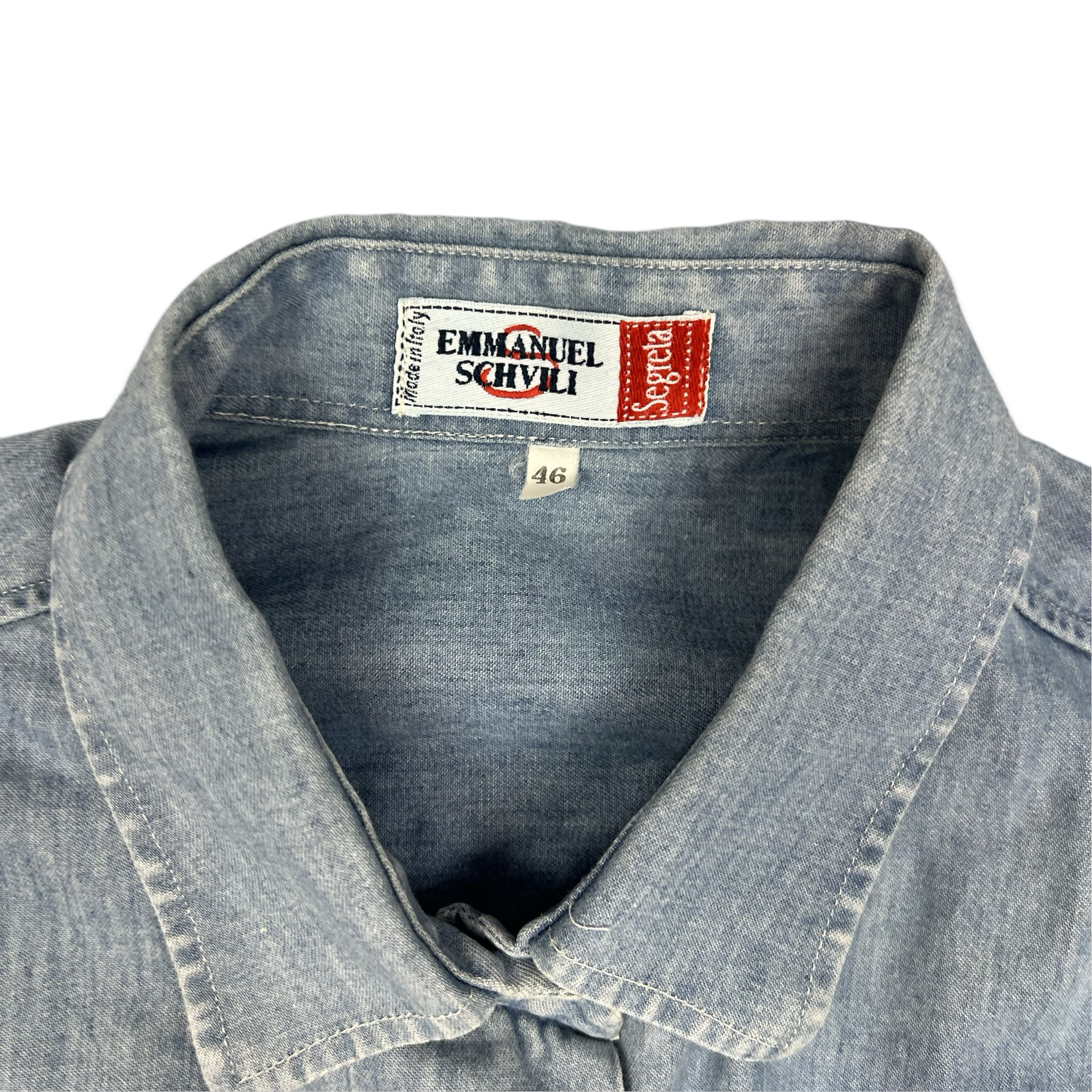 Vintage 1980s women's / unisex Emmanuel Schvili Disney denim shirt with embroidered Goofy patch over front. Rare shirt!