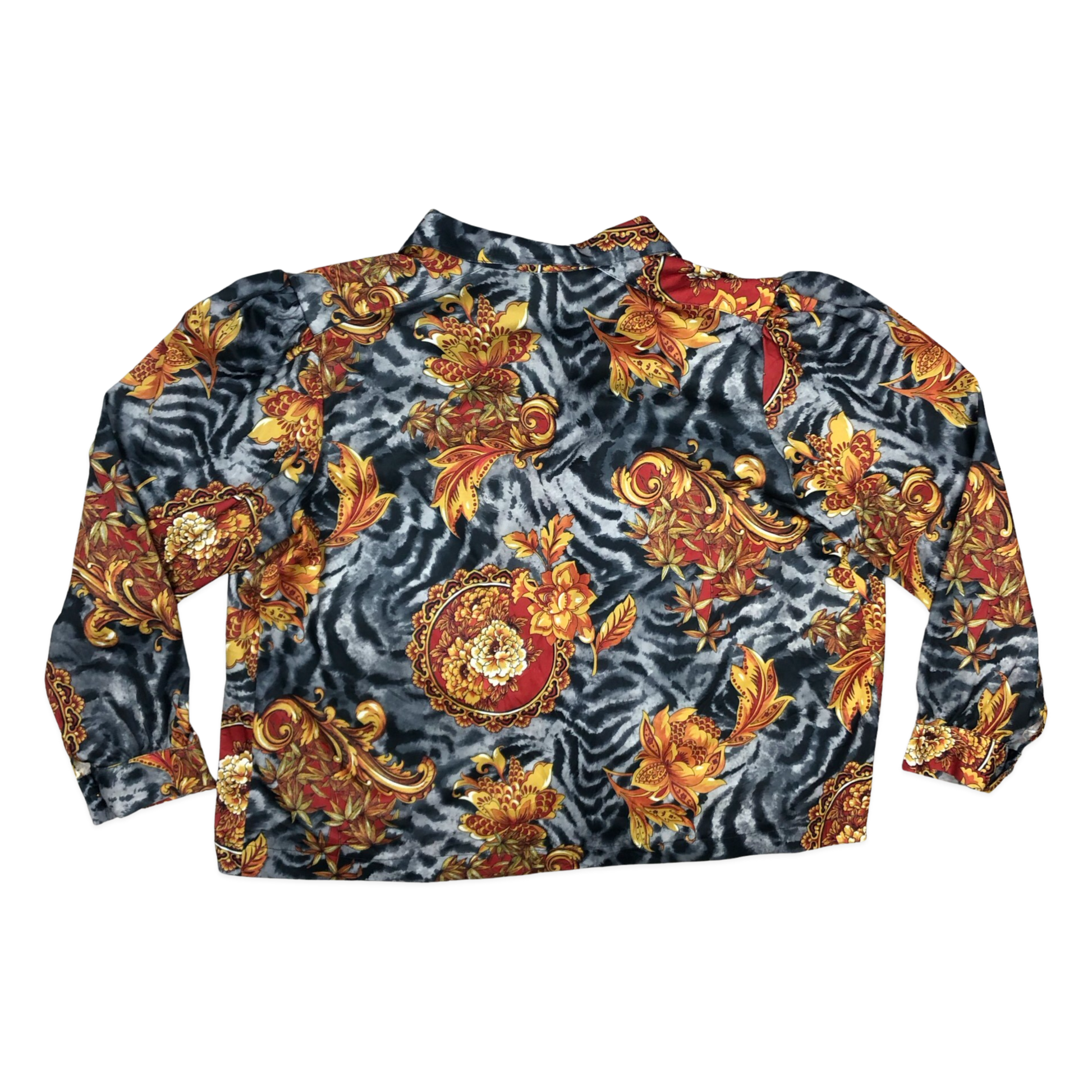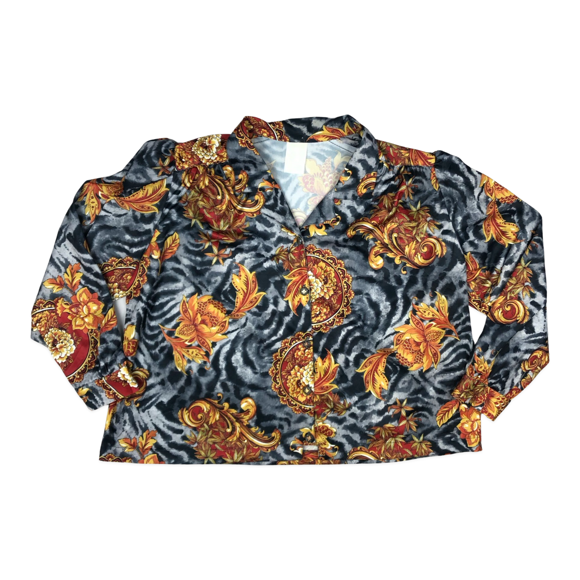 Vintage 80s 90s button-up blouse in grey with orange and red floral print.