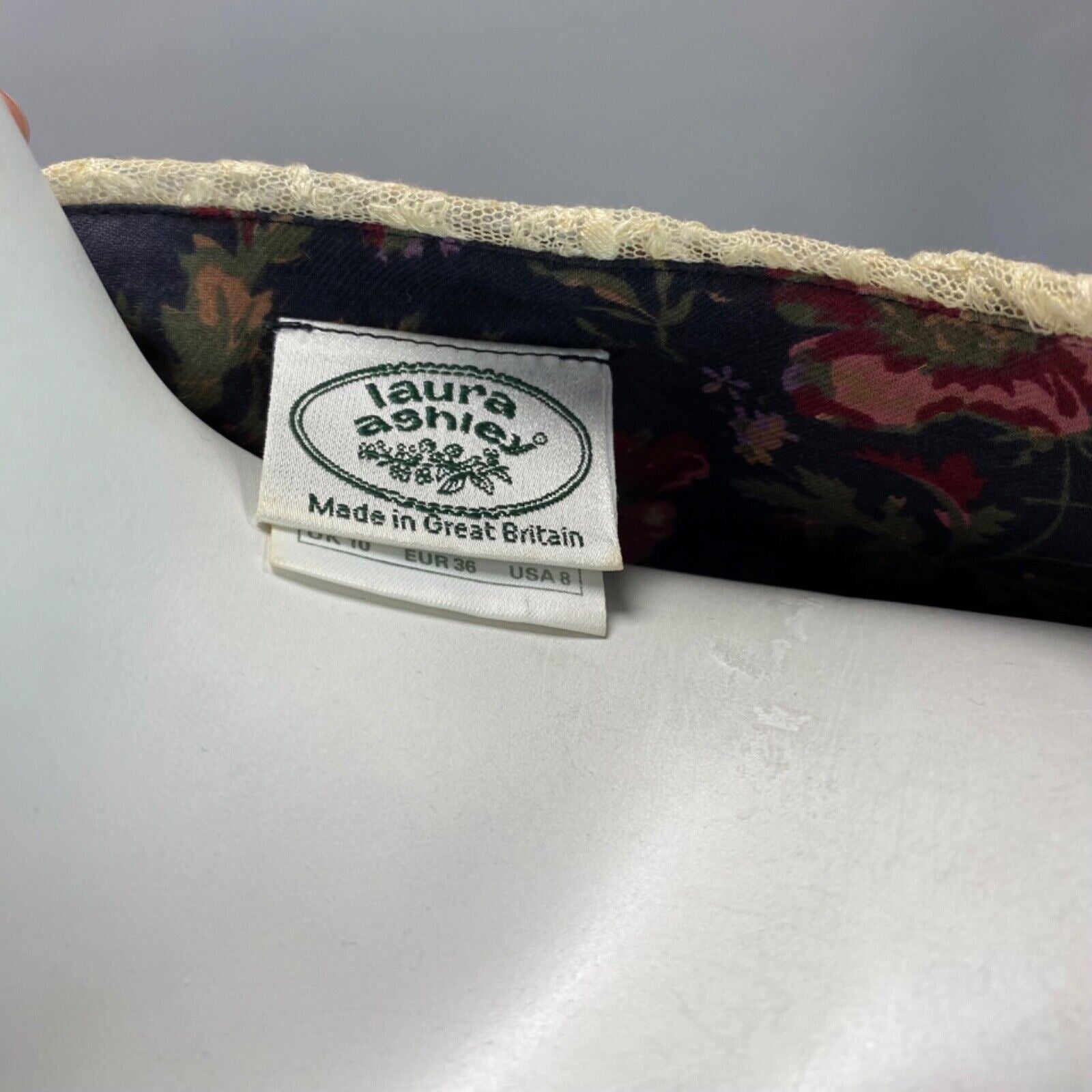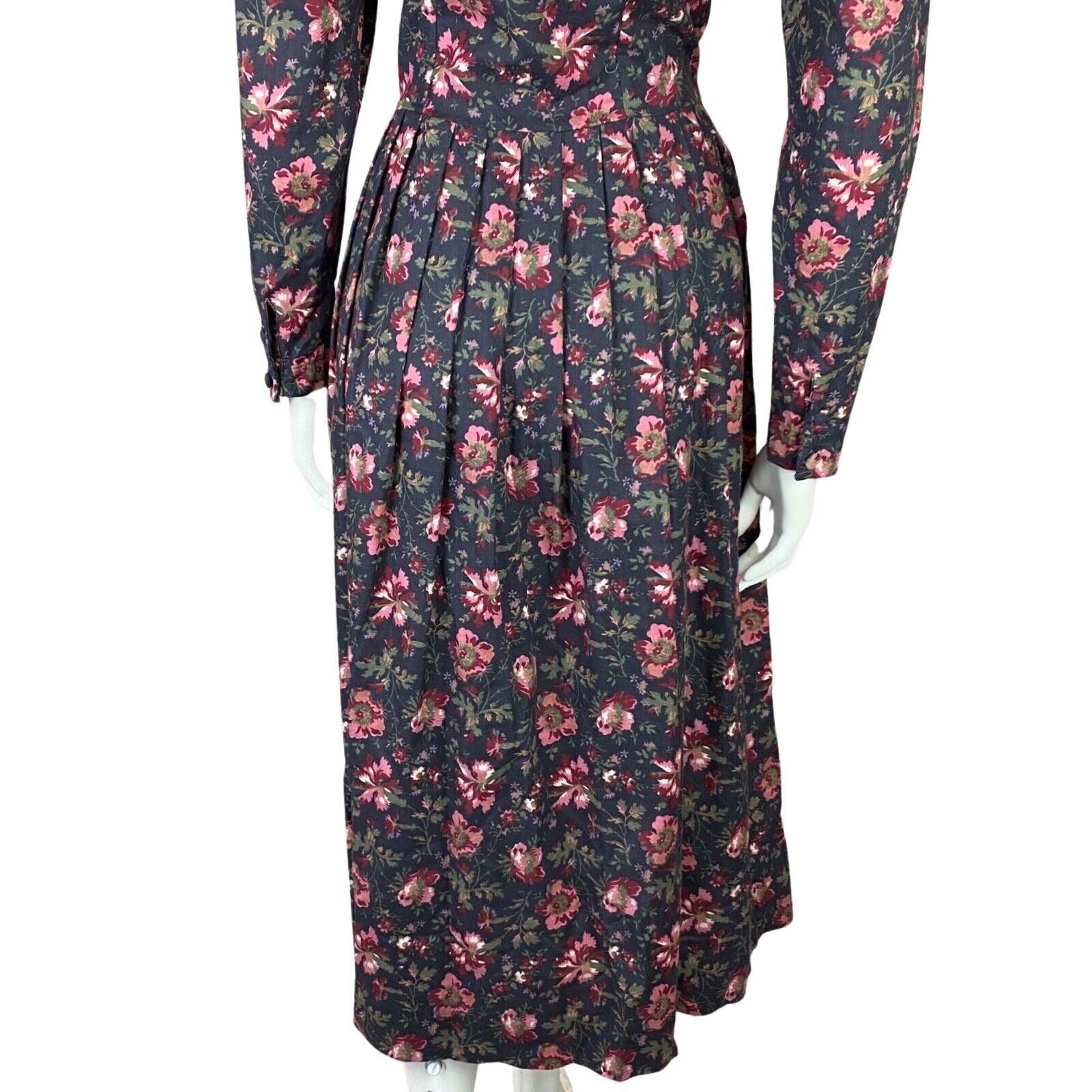 Vintage 80s Laura Ashley Charcoal Pink Floral Lace Trim Long Sleeve Dress 8 10 S