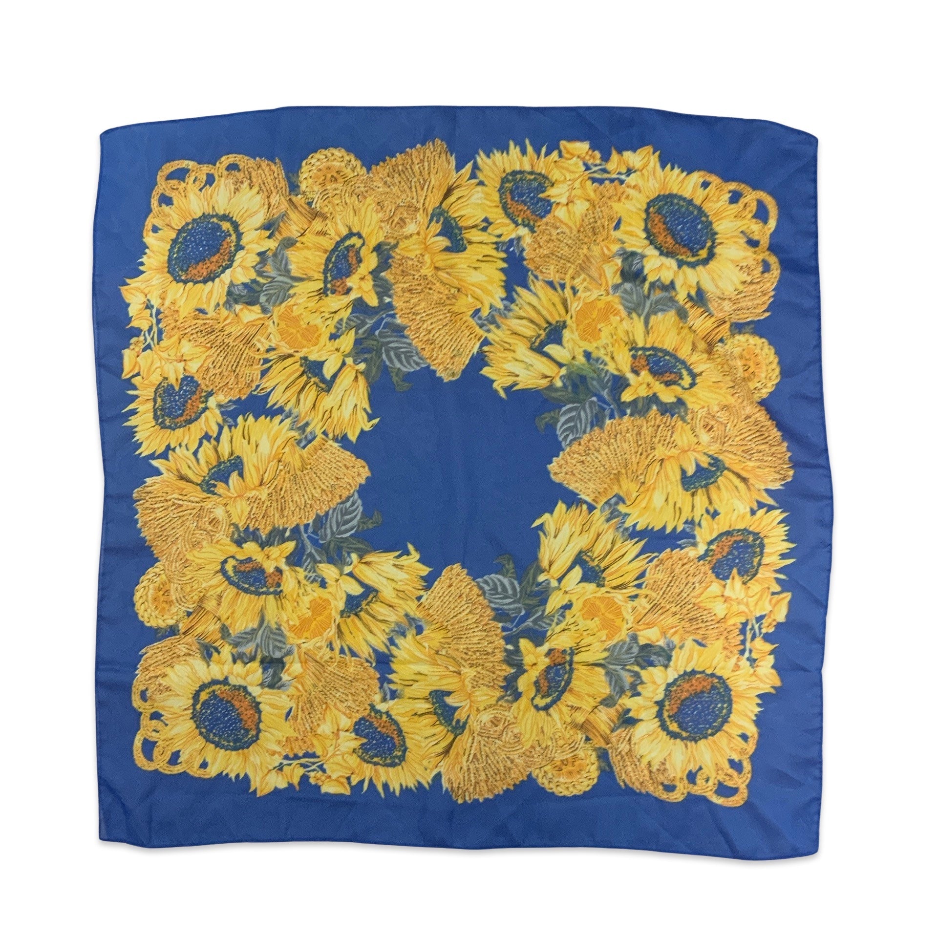 Vintage 80s Organza Blue Yellow Sunflower Print Scarf