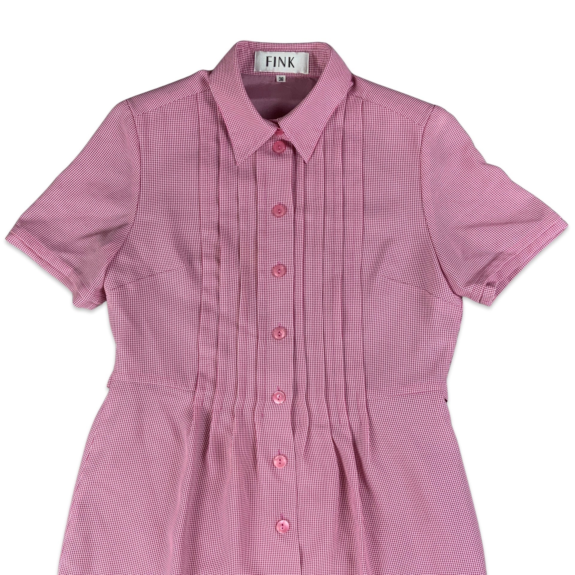 Women’s 1980s shirt dress. Pink and white gingham check fabric with pink buttons. Pleated detail on front and sewn in waist belt tied at the back. Has small shoulder pads.