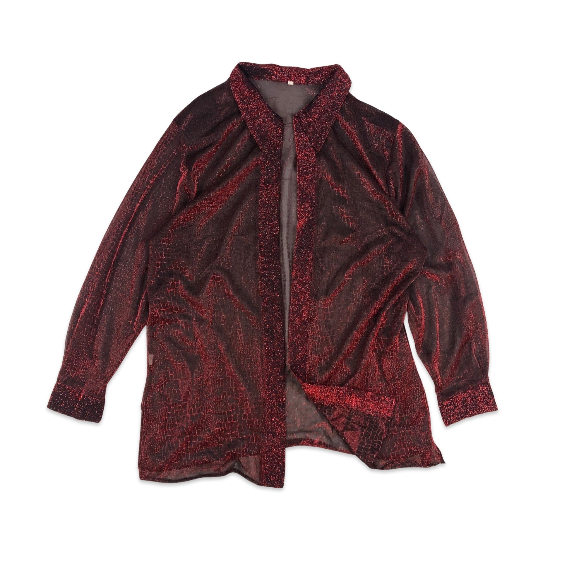Vintage 80s sheer open oversize blouse in red lurex with collar and shoulder pads.
