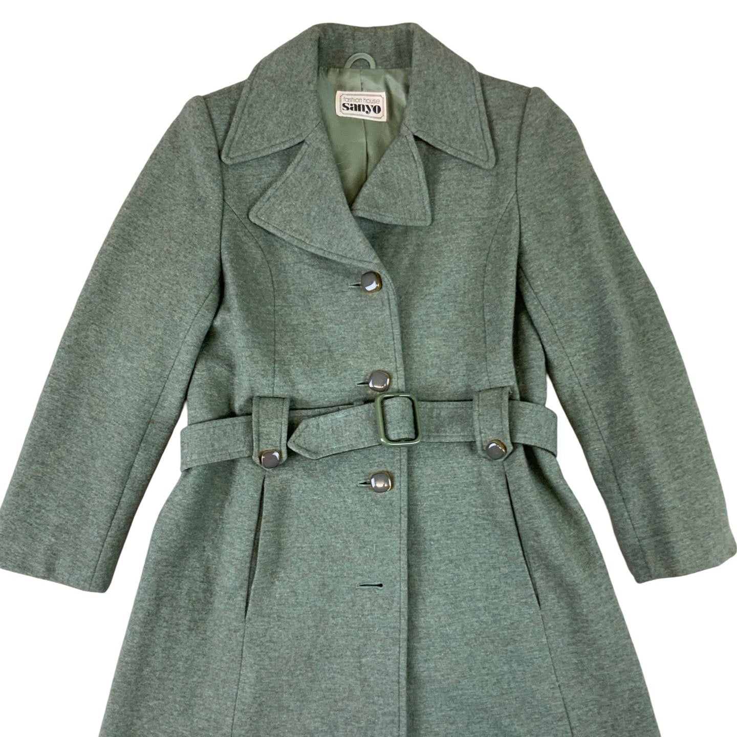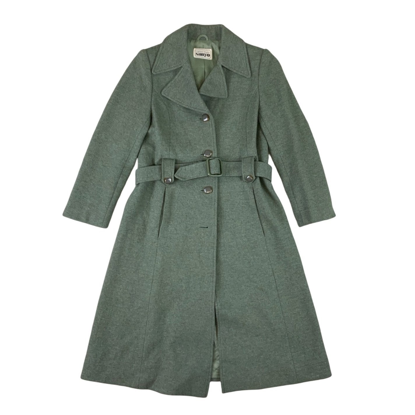 Vintage sage green swing coat. Matching belt with two front pockets . front button up fastening. 100% wool.