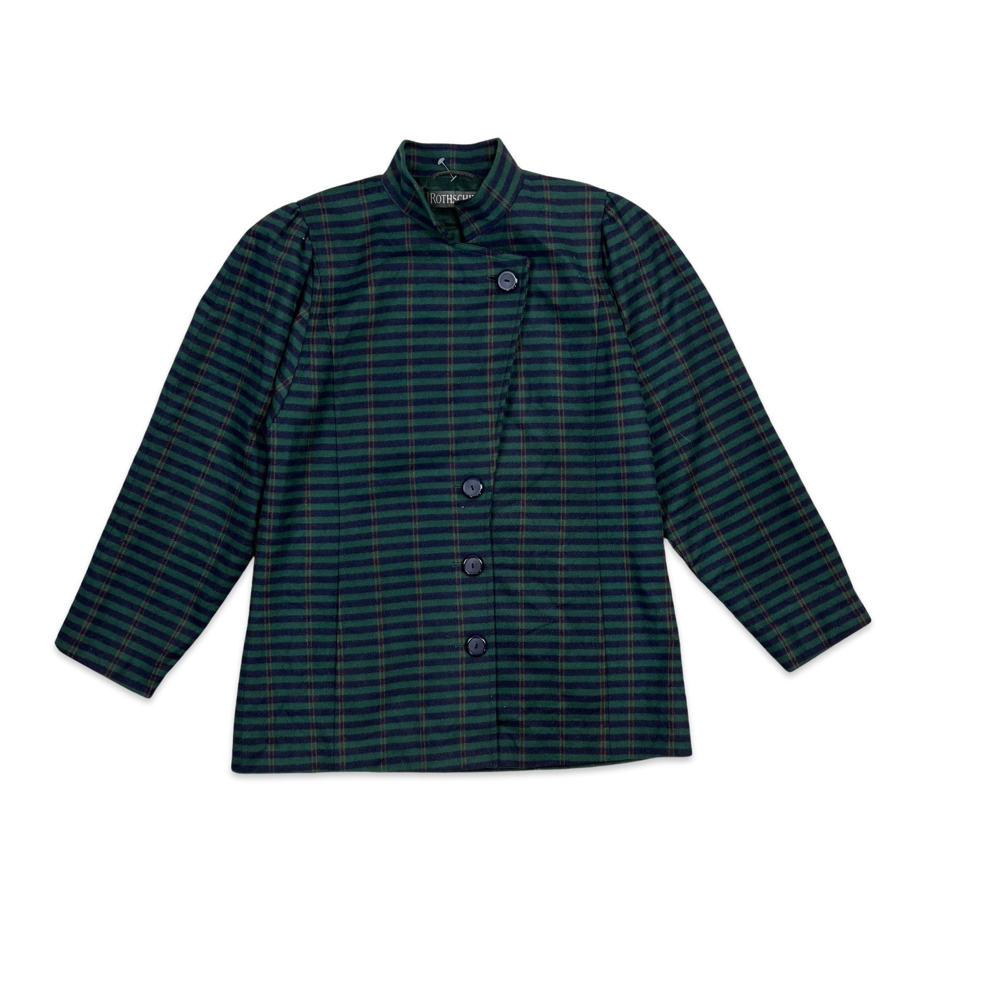 Vintage Rothschild 80s midi wool oversized coat. Double breasted jacket. Green, purple, orange stripe, plaid, tartan print. Asymmetrical button front fastening.