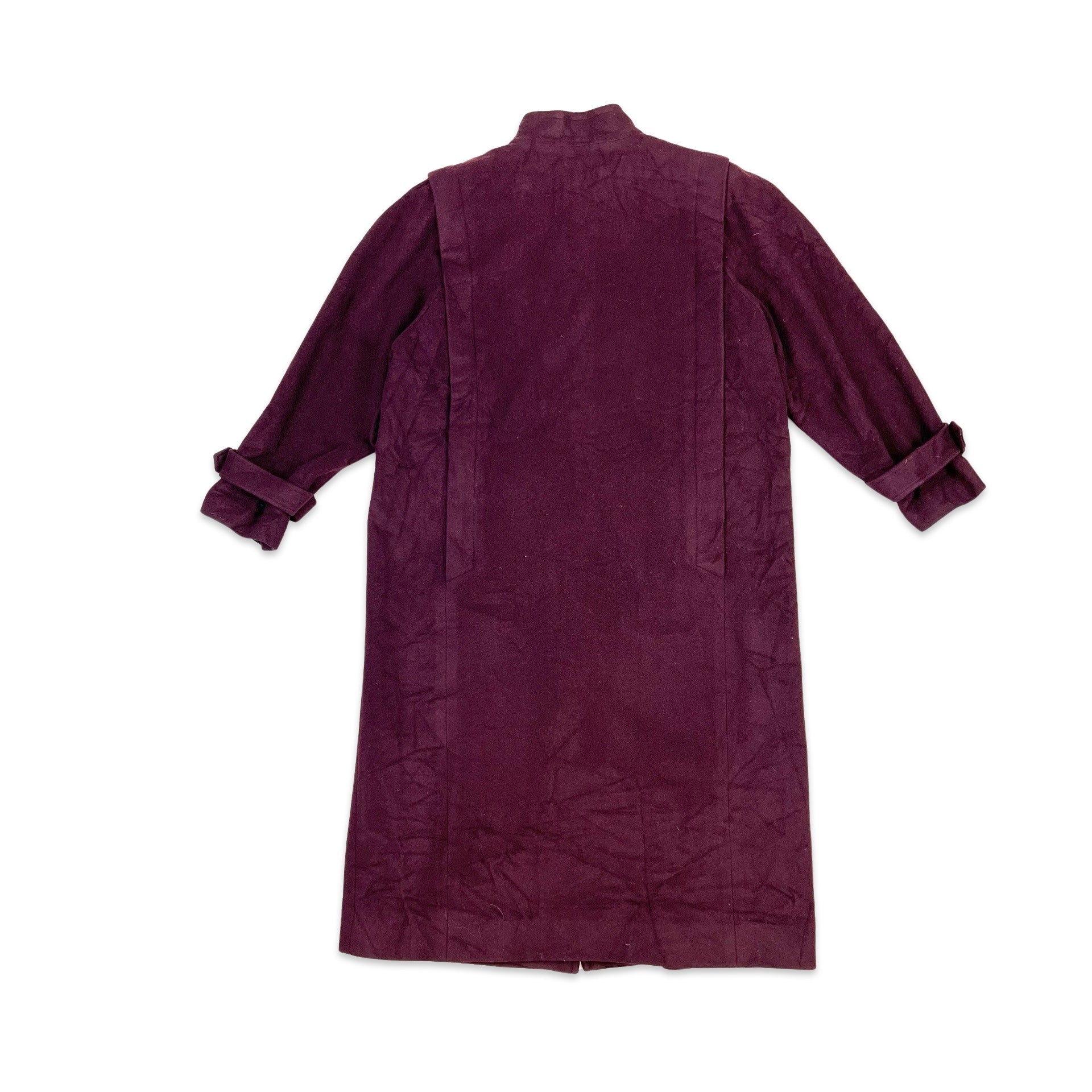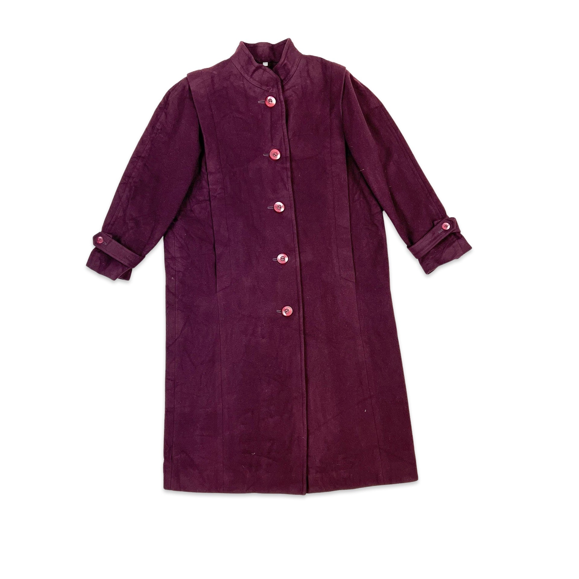Vintage 80s 90s wool burgundy purple longline duster coat. Button fastening, front pockets.