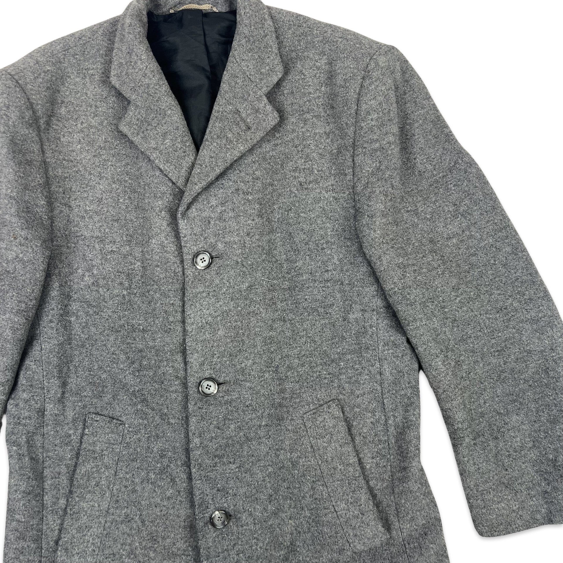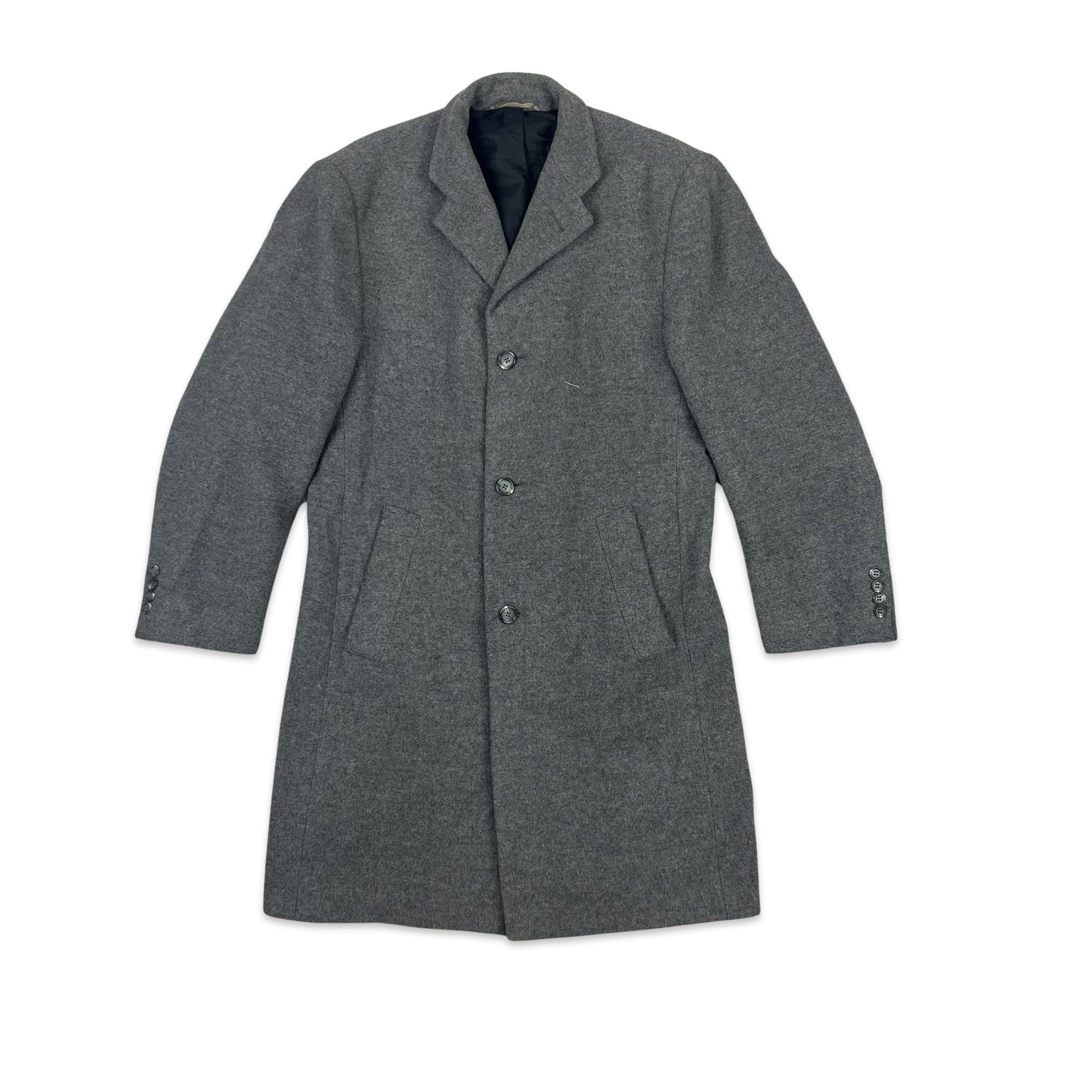Vintage 80s wool midi coat in grey. Grey button fastening, fully lined, side pockets, oversized fit.