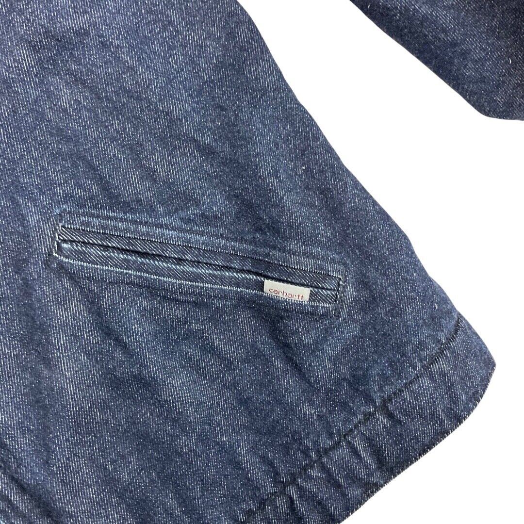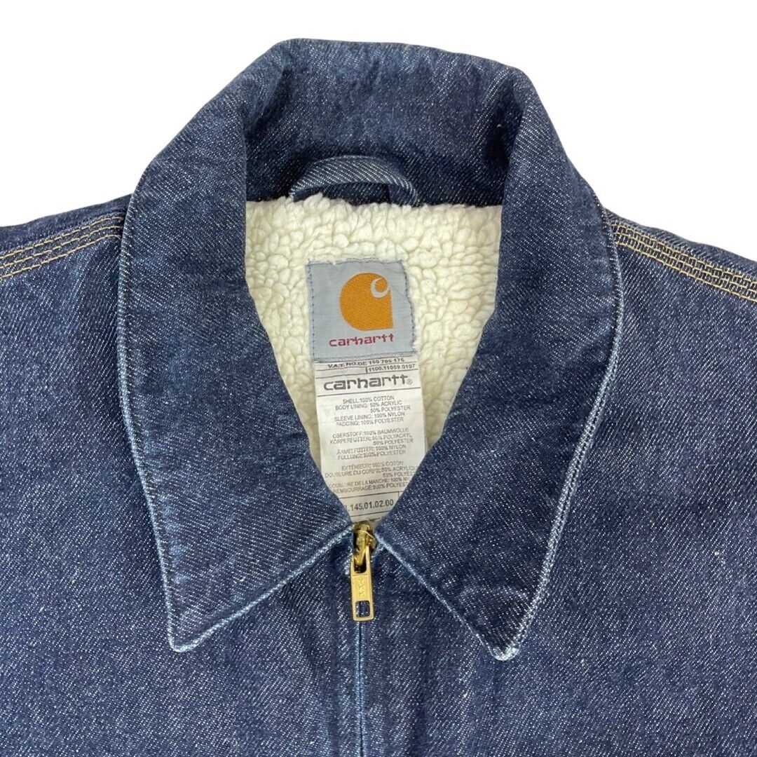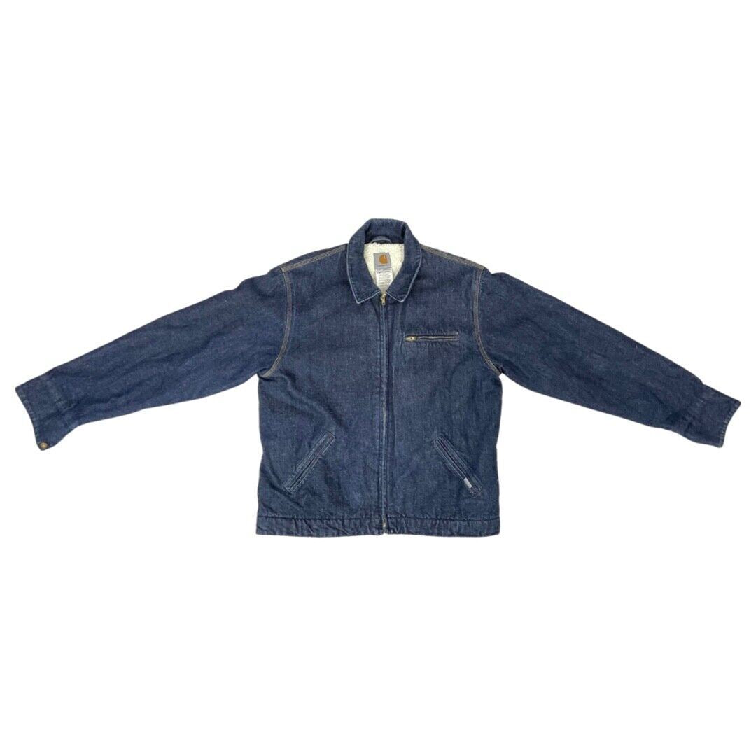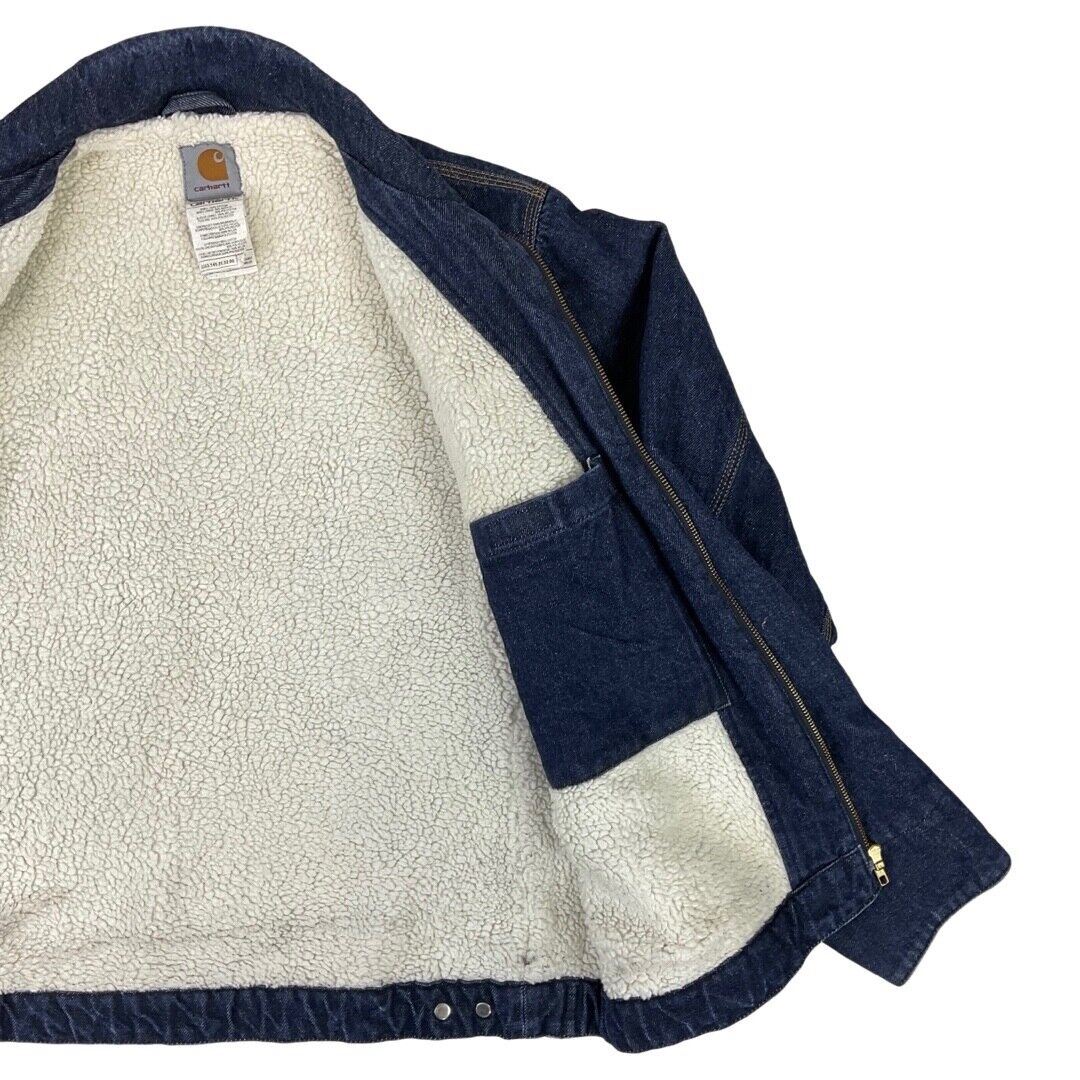 This is a great Carhartt jacket made from a deep blue, denim fabric with a soft fleecey sherpa lining.