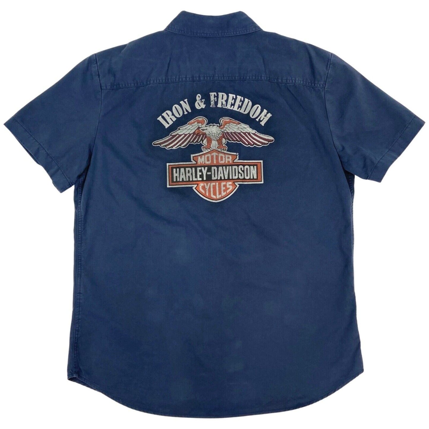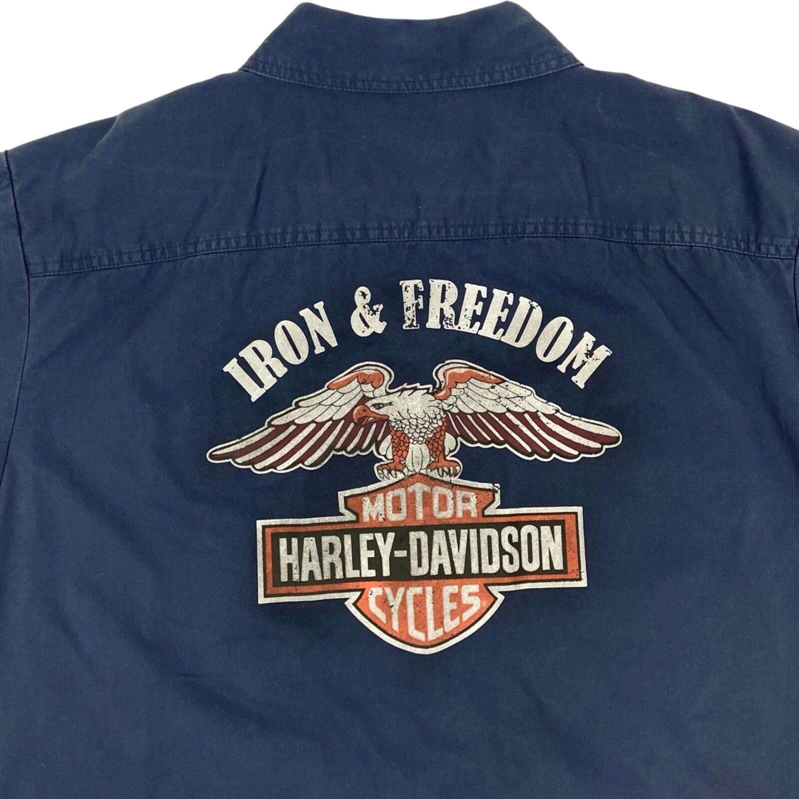 This is a dark blue Harley Davidson button down shirt. There are two front buttoned pockets and an embroidered Harley logo patch. The founding date of the company (1903) is embroidered into the other side. The back of the shirt has a printed logo with an eagle above with the words ‘Iron and Freedom’. This piece would look great worn more oversized but all measurements are listed below.