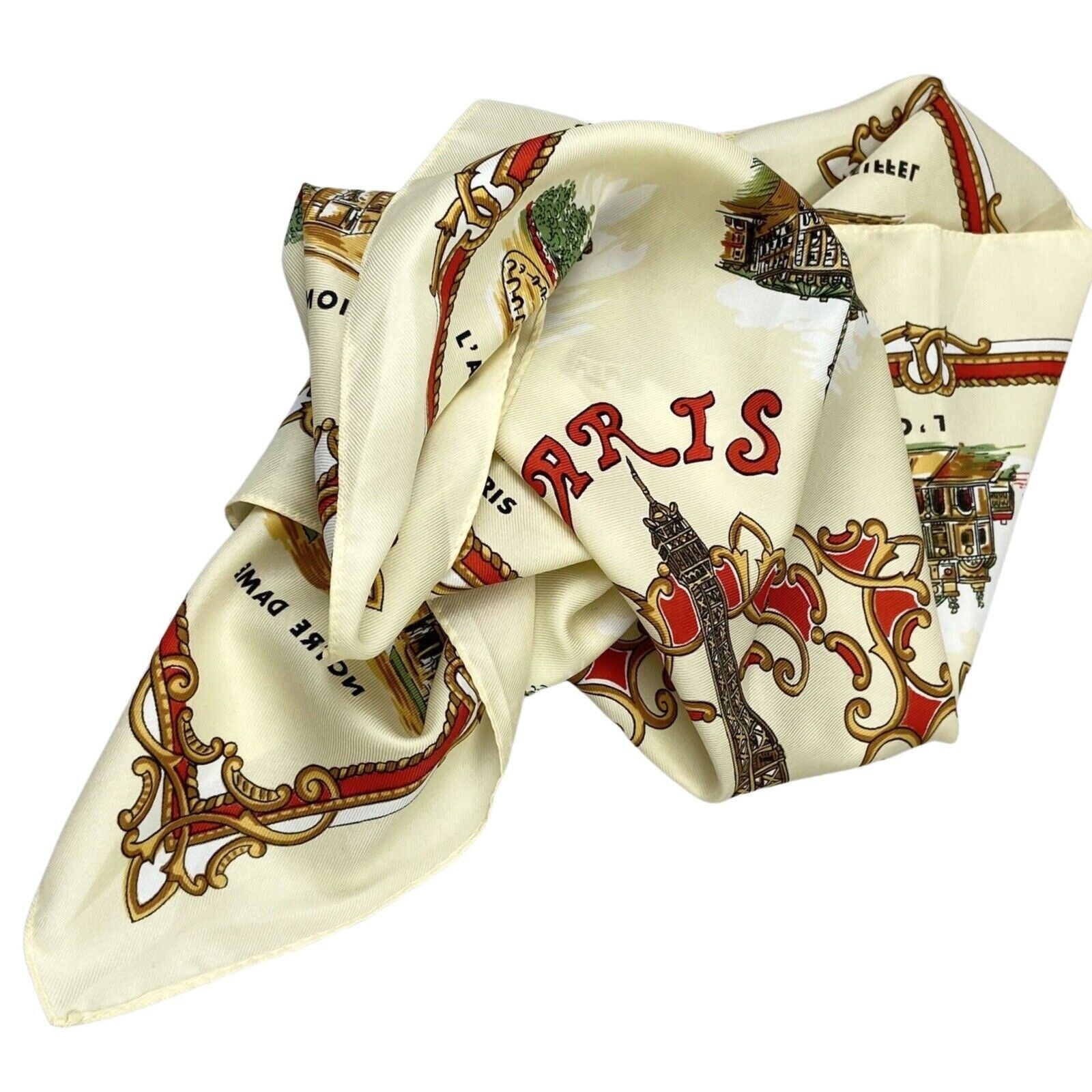 Vintage 90s 00s Cream Red Paris Graphic Print Patterned Scarf
