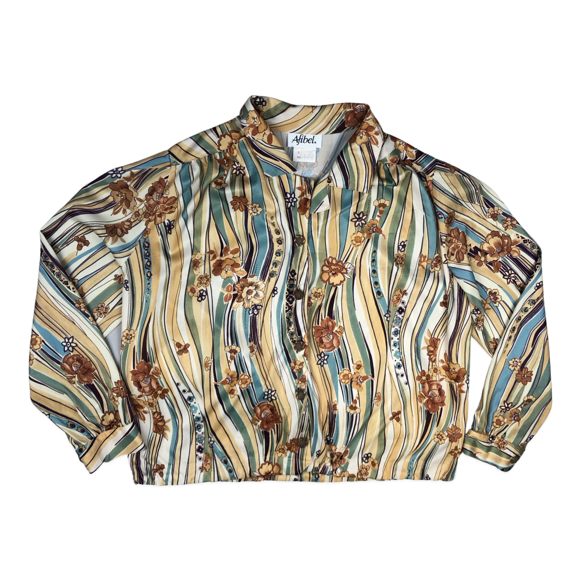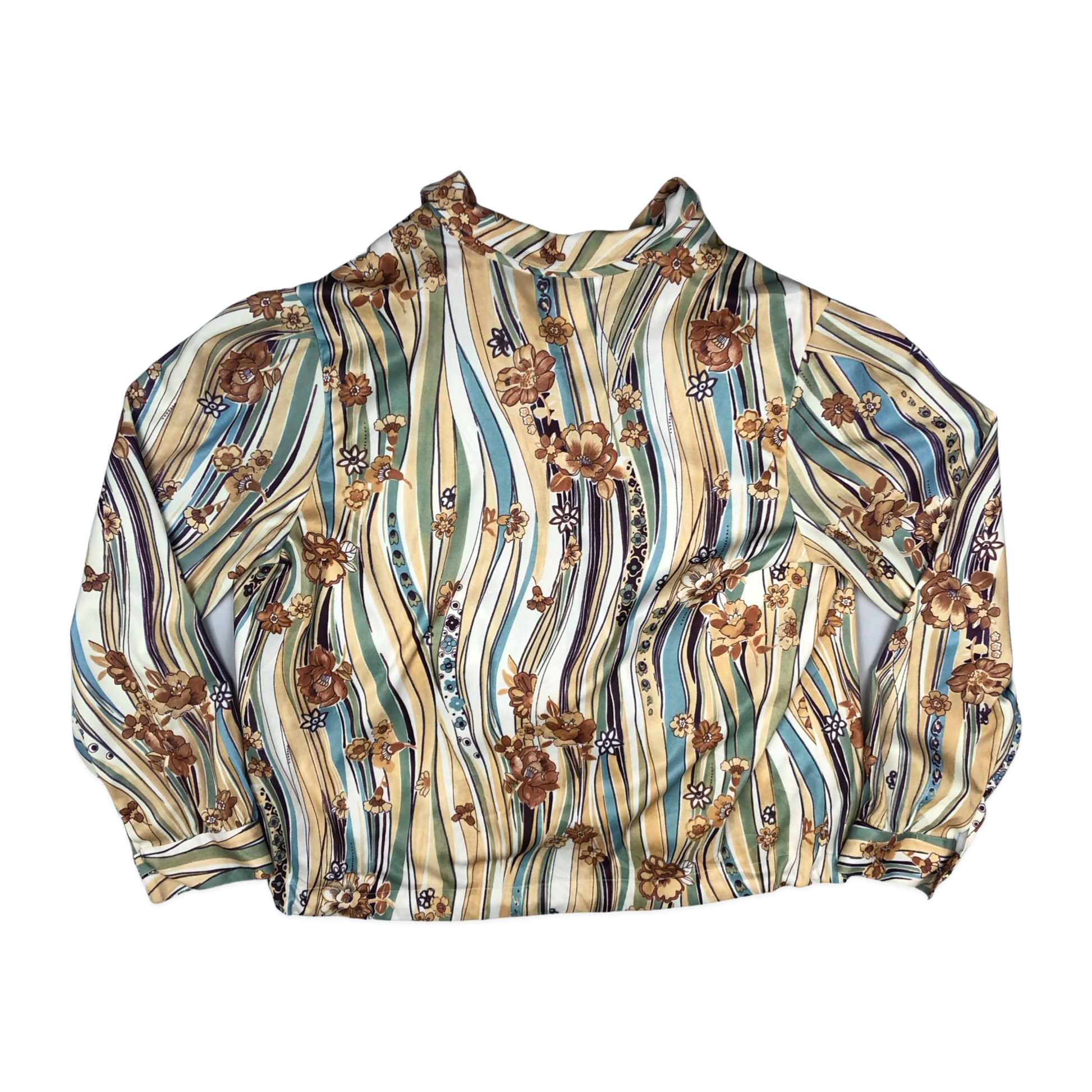 Vintage button-up blouse with autumnal floral stripy print and detailed metal buttons.