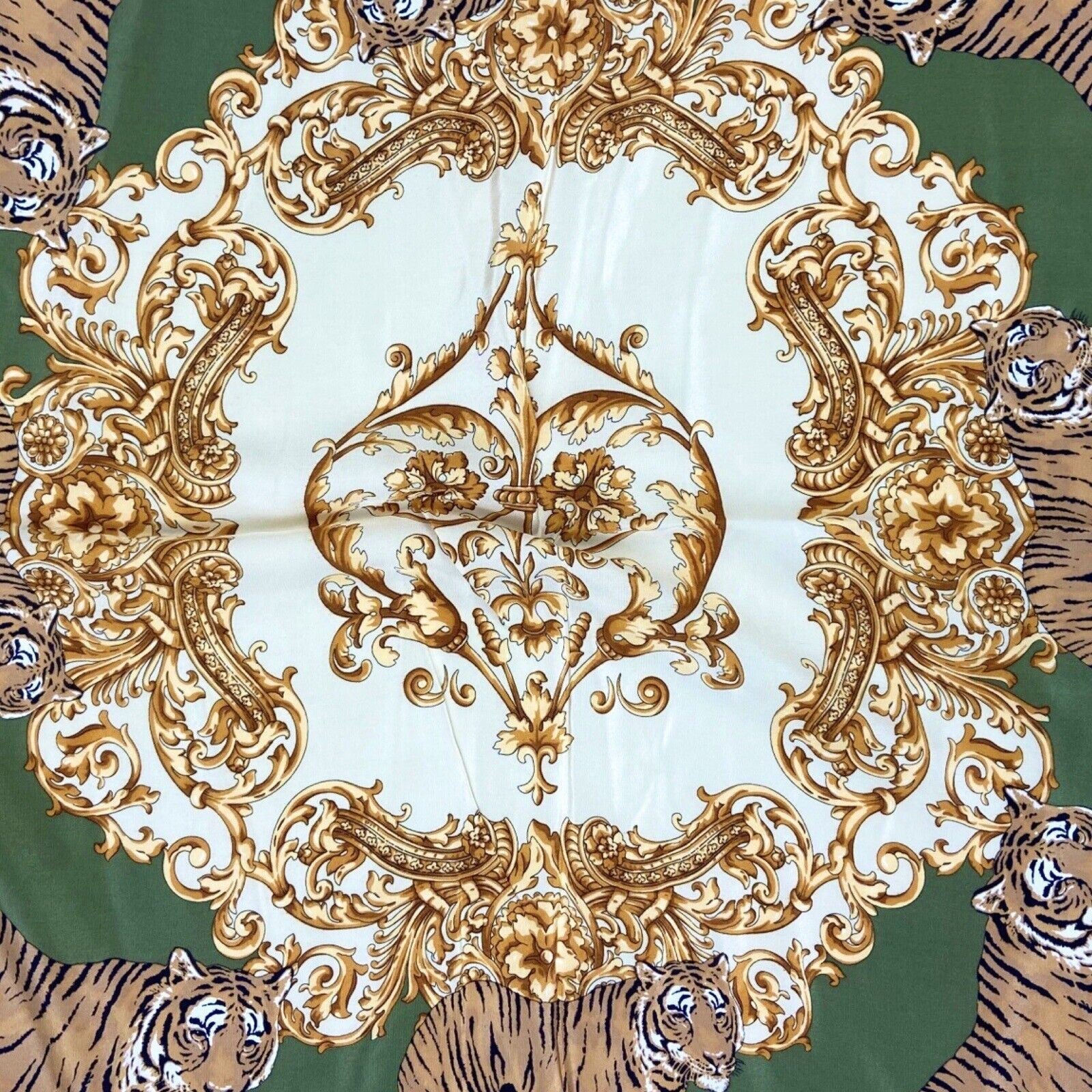 Vintage 90s 00s Green Gold Tiger Graphic Print Filigree Ornamental Silk Scarf