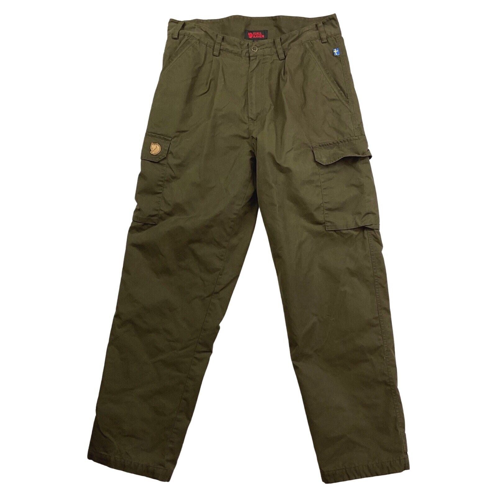 This is a nice pair of Fjällräven utility trousers made from a khaki green heavy weight polyester material with minimal stretch and a padded lining. Features include; two front pockets and two cargo style pockets on each leg, the Fjällräven logo stitched onto one of the pockets and branded buttons. This item is in great condition overall.