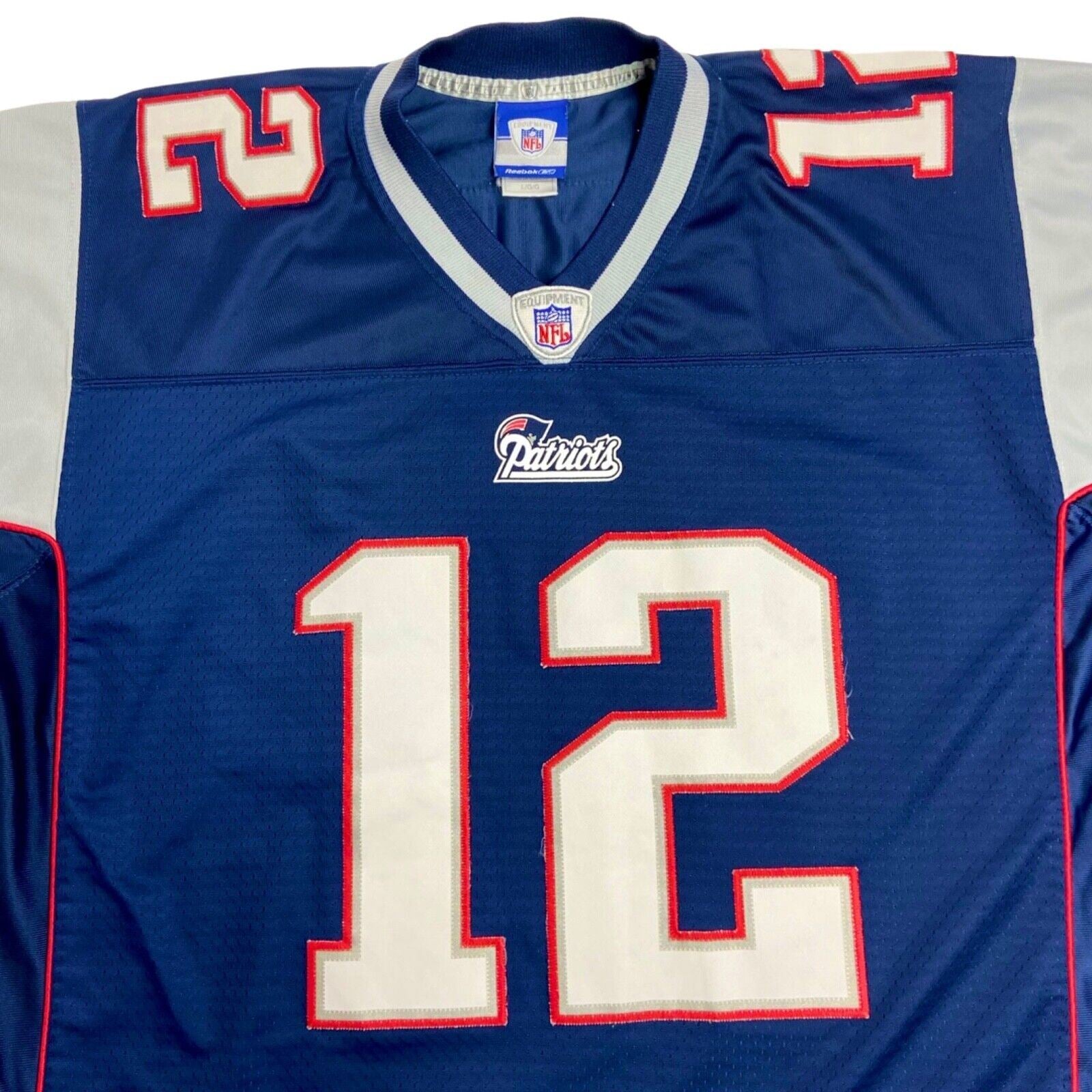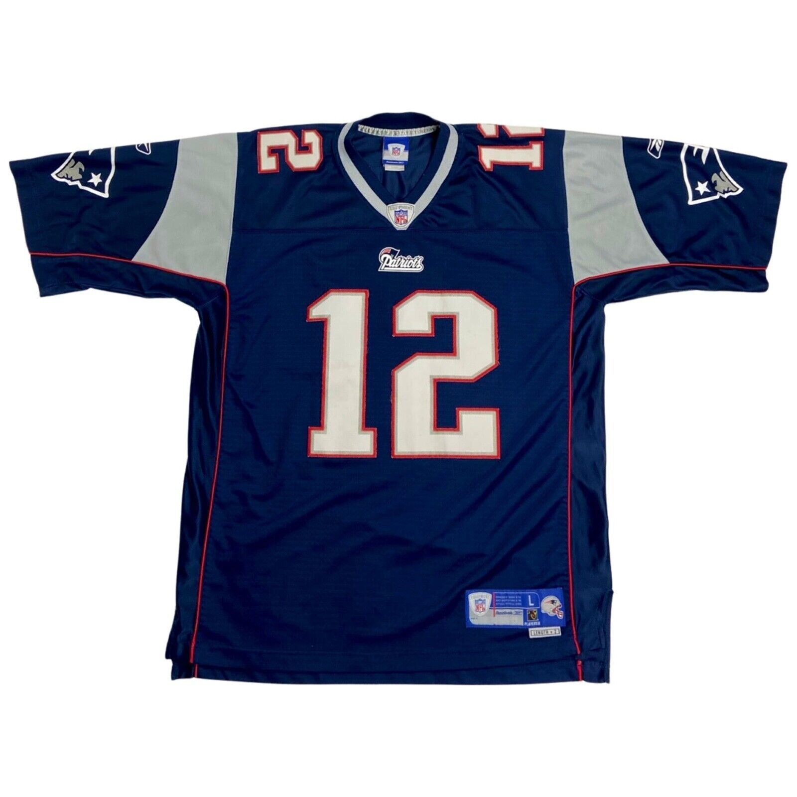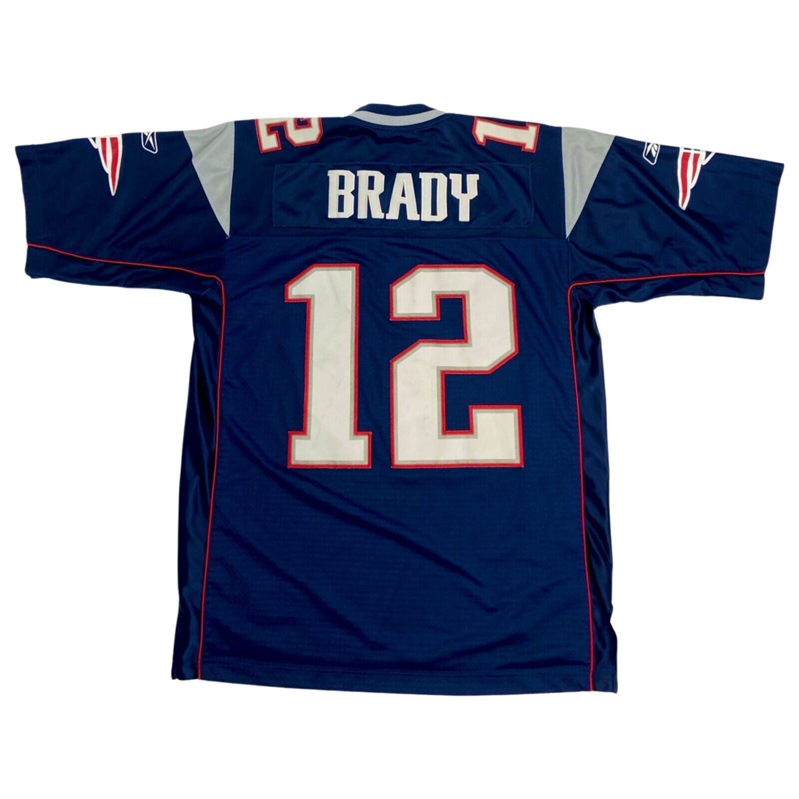 This is rare vintage NFL, Tom Brady, Patriots jersey. The specific stitched graphics on this piece are more difficult to come by on older NFL jerseys. The jersey has appliqué numbers on the front, back, and both shoulders. In addition to this the embroidered NFL logo can be seen at the front as well as a ‘Brady’ spell out stitched on the back.