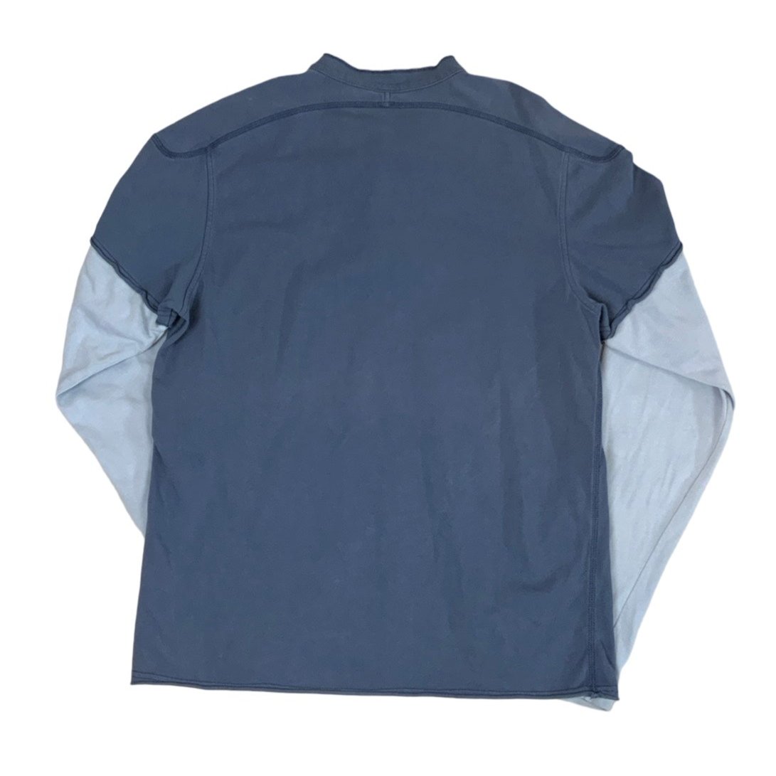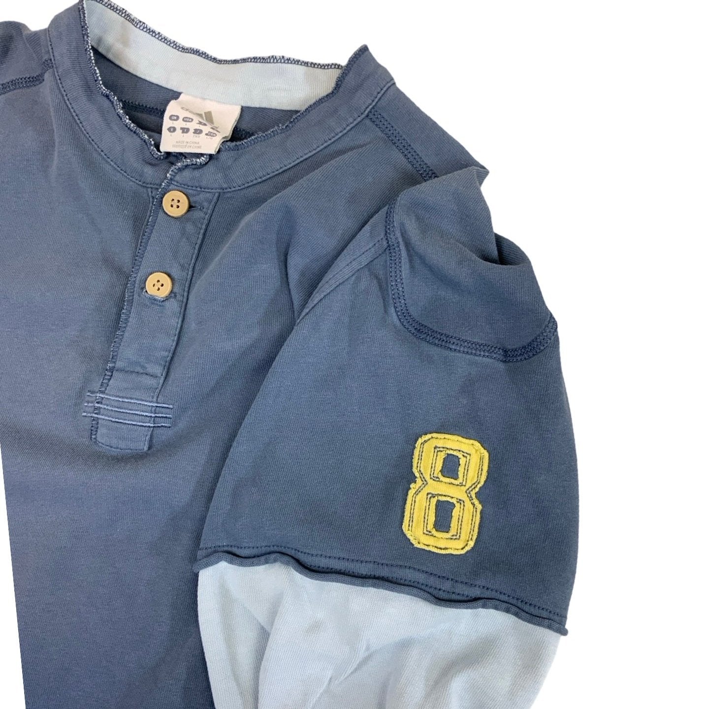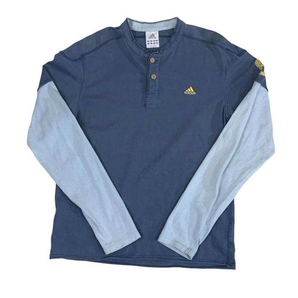 Vintage Adidas long sleeve faded blue t-shirt with lighter blue sleeves, high neck with two buttons and adidas logo on the chest. 100% cotton.