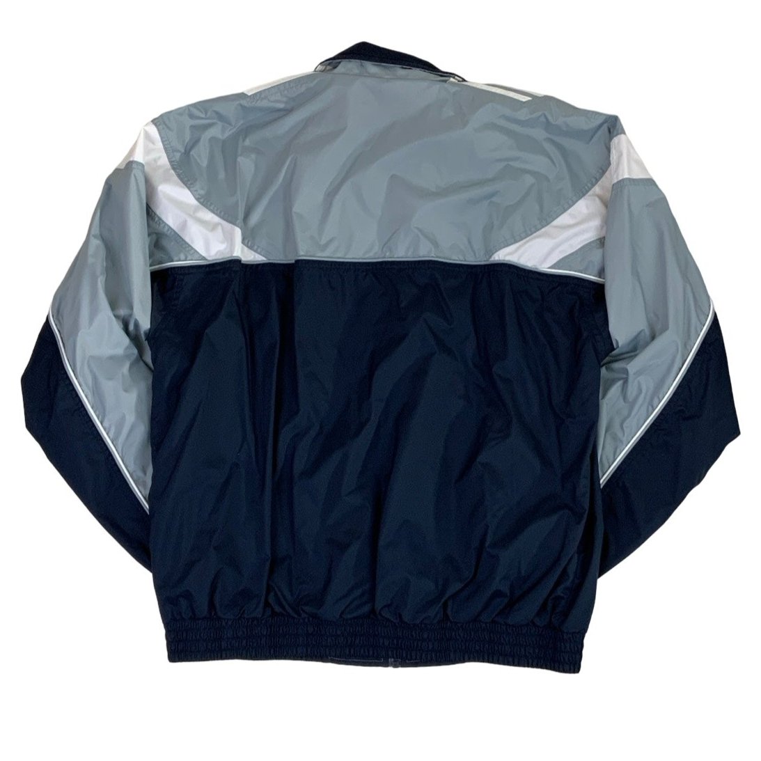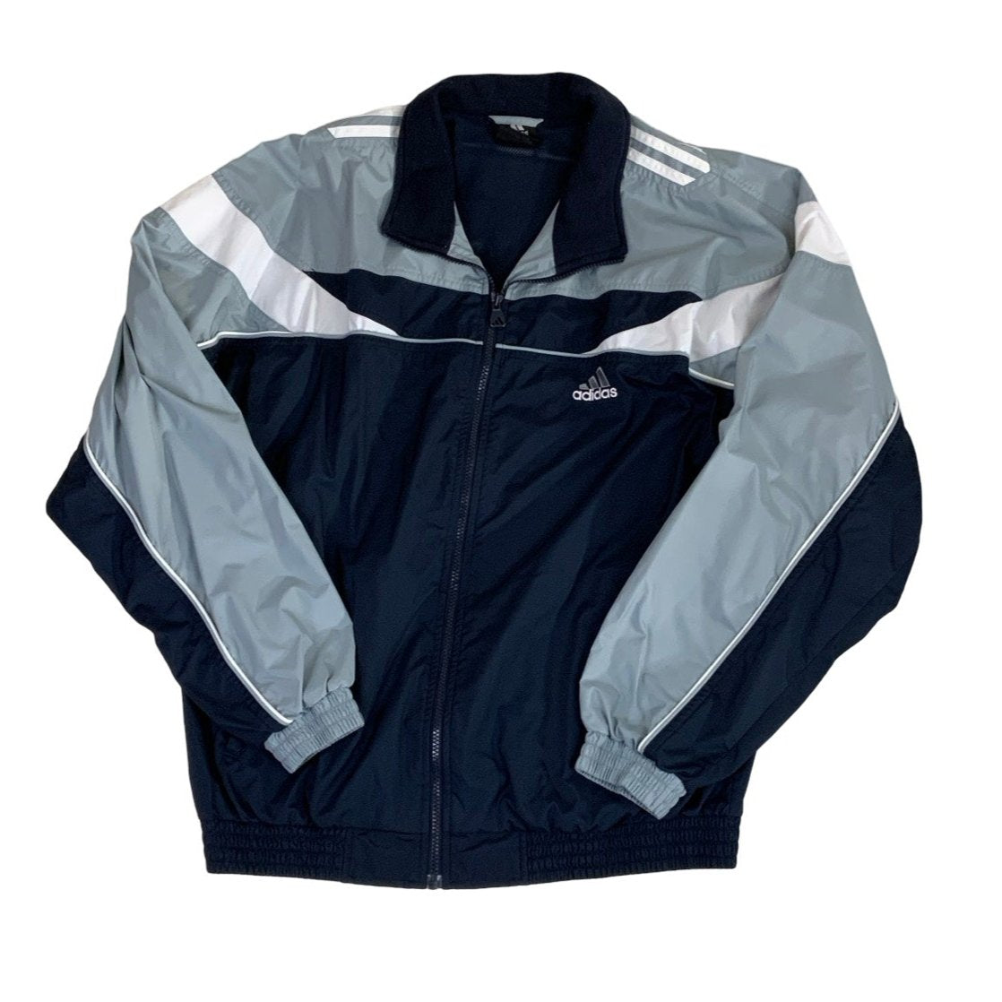 90s Adidas zip-up track jacket in grey, back, navy blue and white with elasticated waistband and cuffs, side pockets, and net lining.