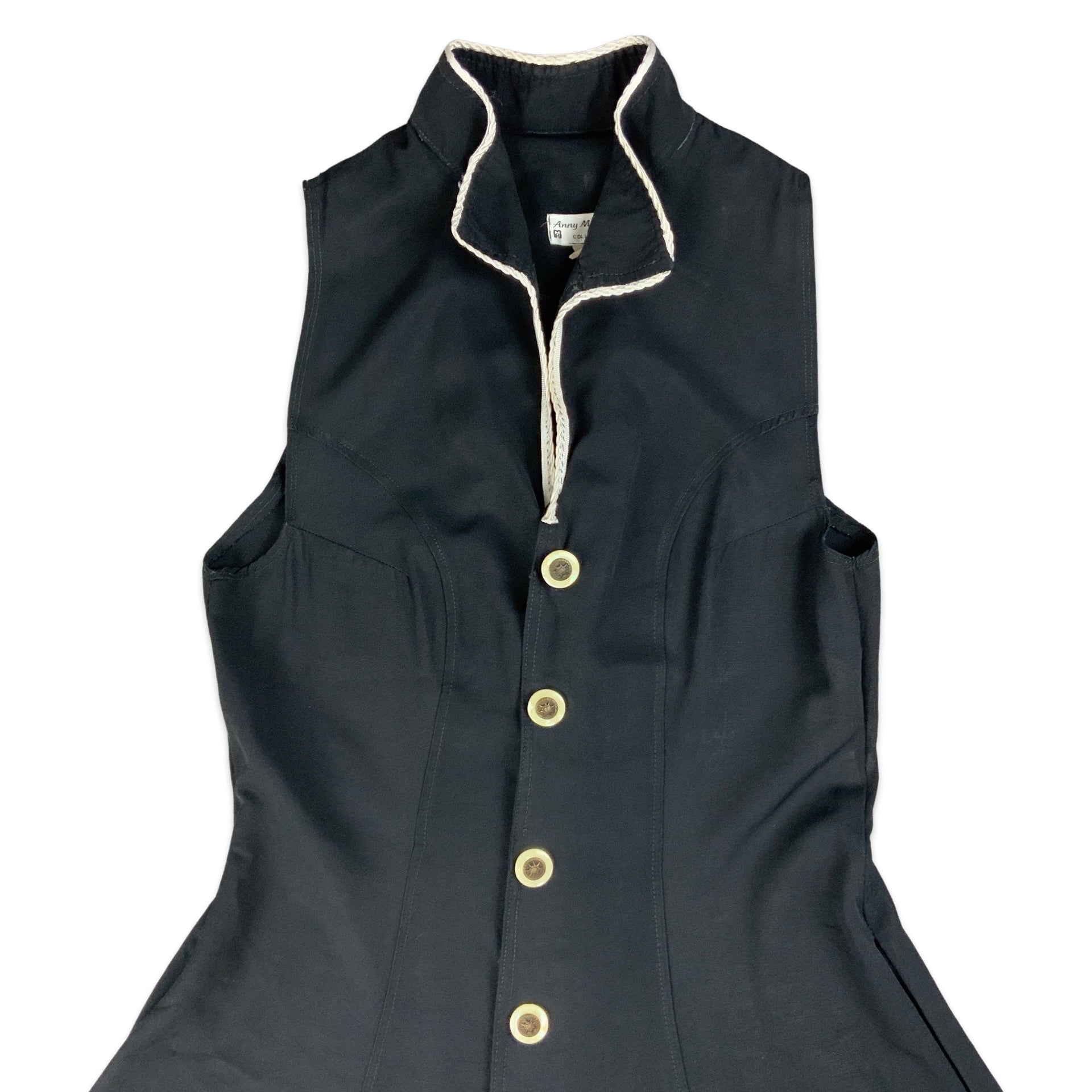 Women’s 90s maxi dress. Black with white trim around the collar and pearly white and brass gold buttons.