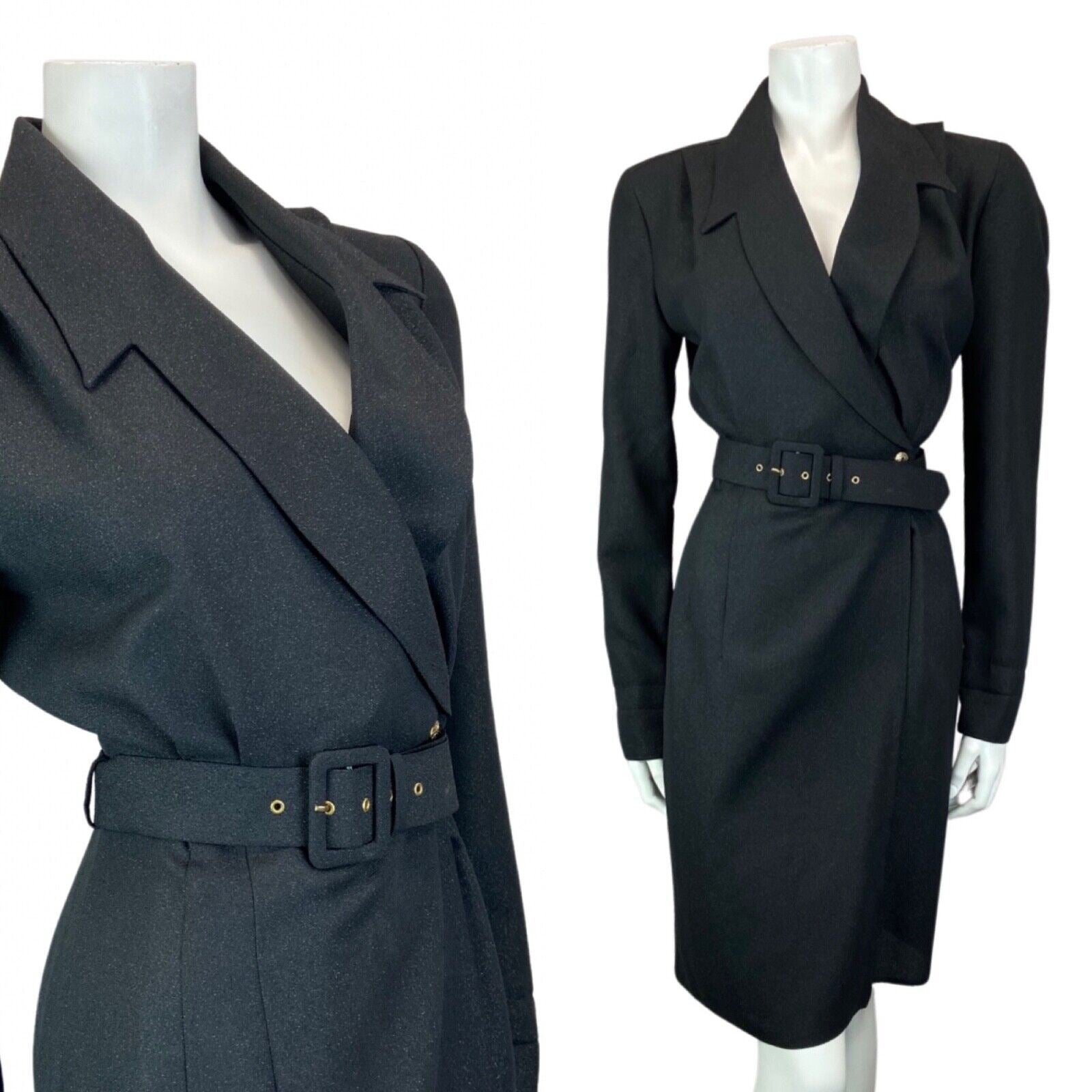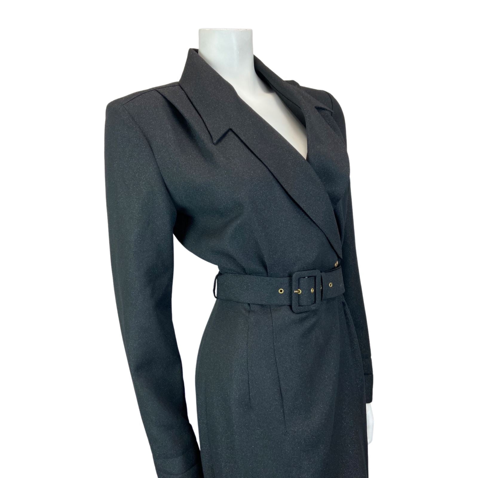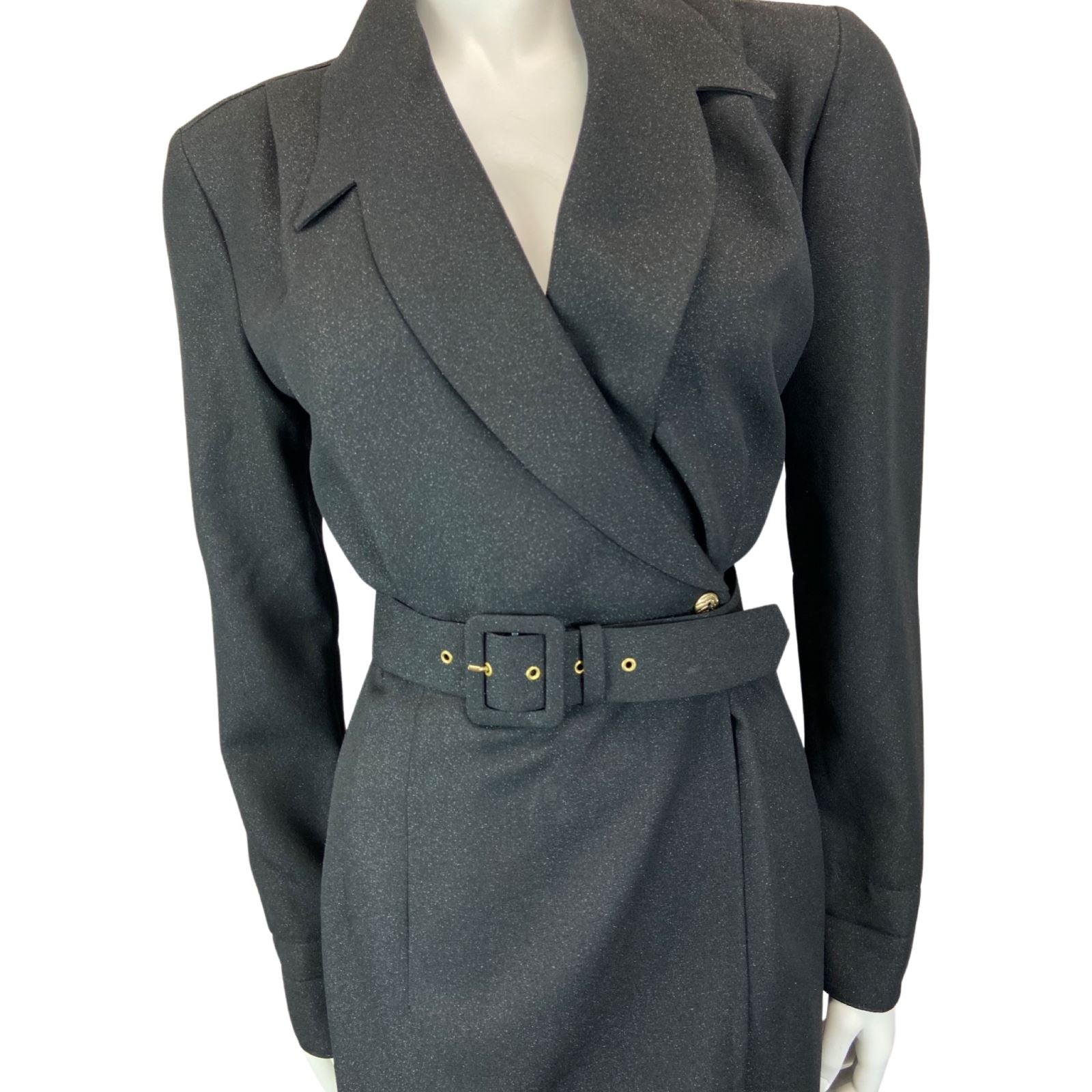 This is a gorgeous 90s blazer wrap around dress made from a black glittery polyester material with minimal stretch. Features include; a low neckline with lapels, long sleeves, a button to close the wrap around loom of the dress, a large belt and no additional lining.