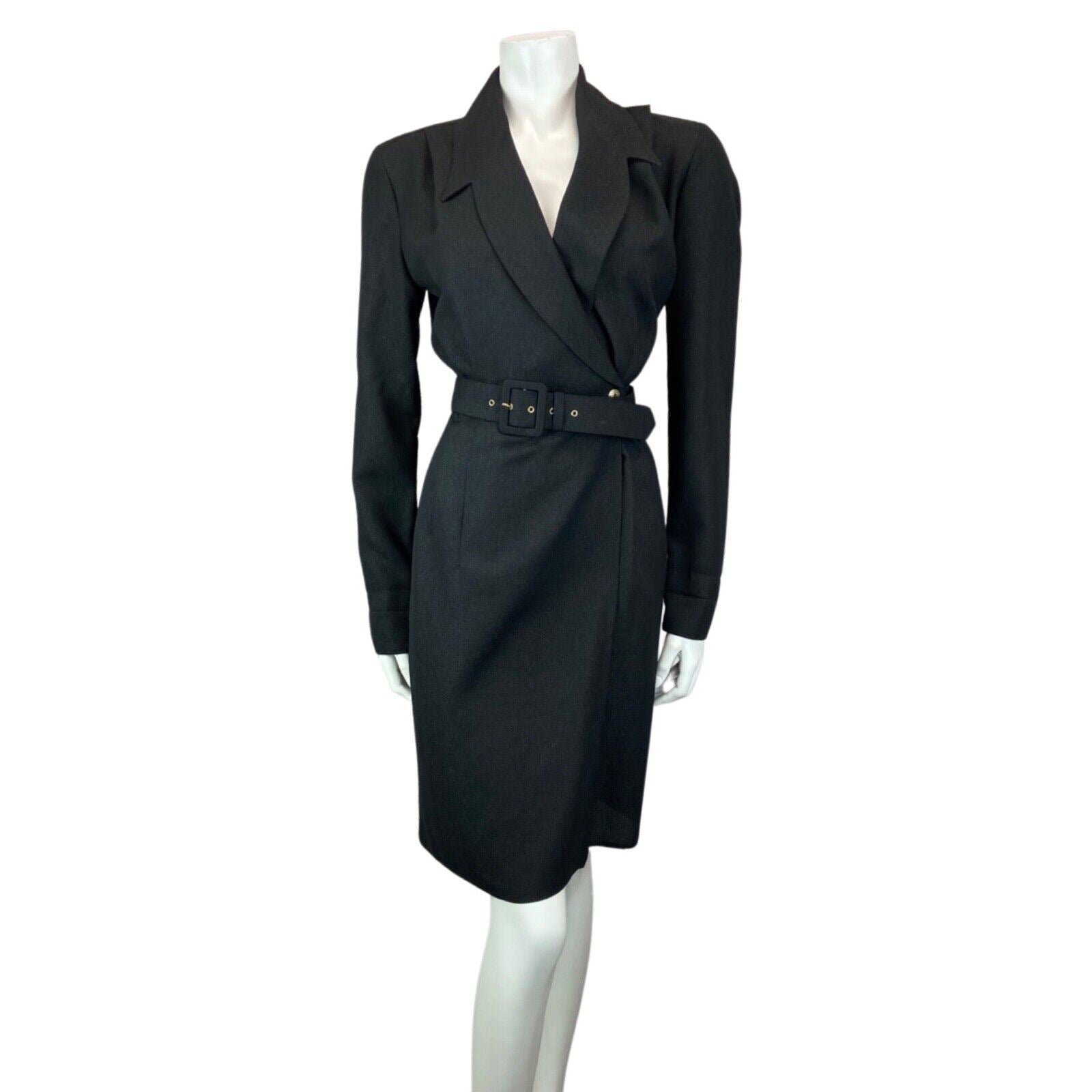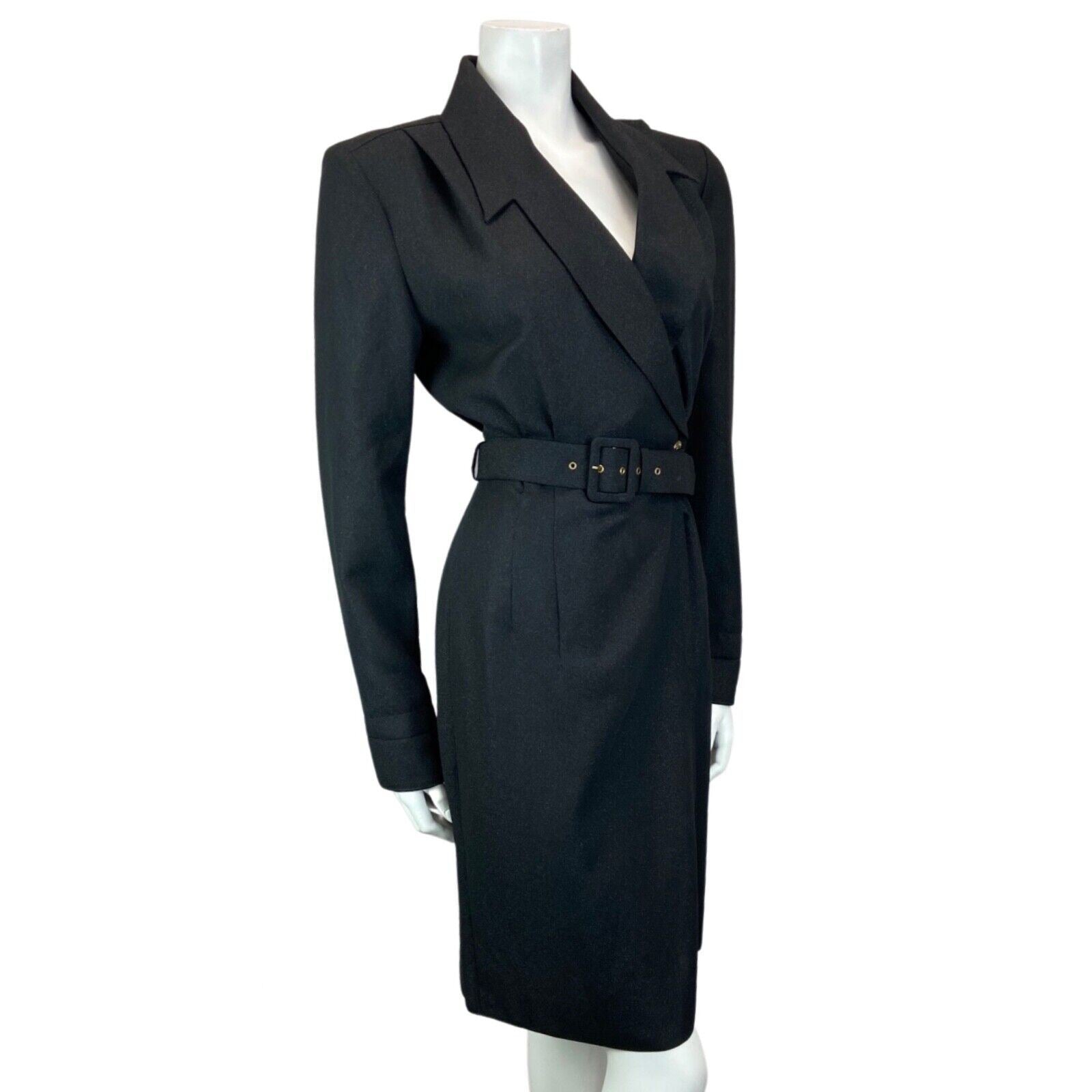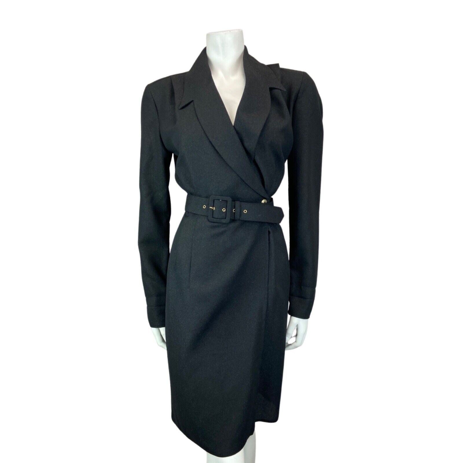 This is a gorgeous 90s blazer wrap around dress made from a black glittery polyester material with minimal stretch. Features include; a low neckline with lapels, long sleeves, a button to close the wrap around loom of the dress, a large belt and no additional lining.
