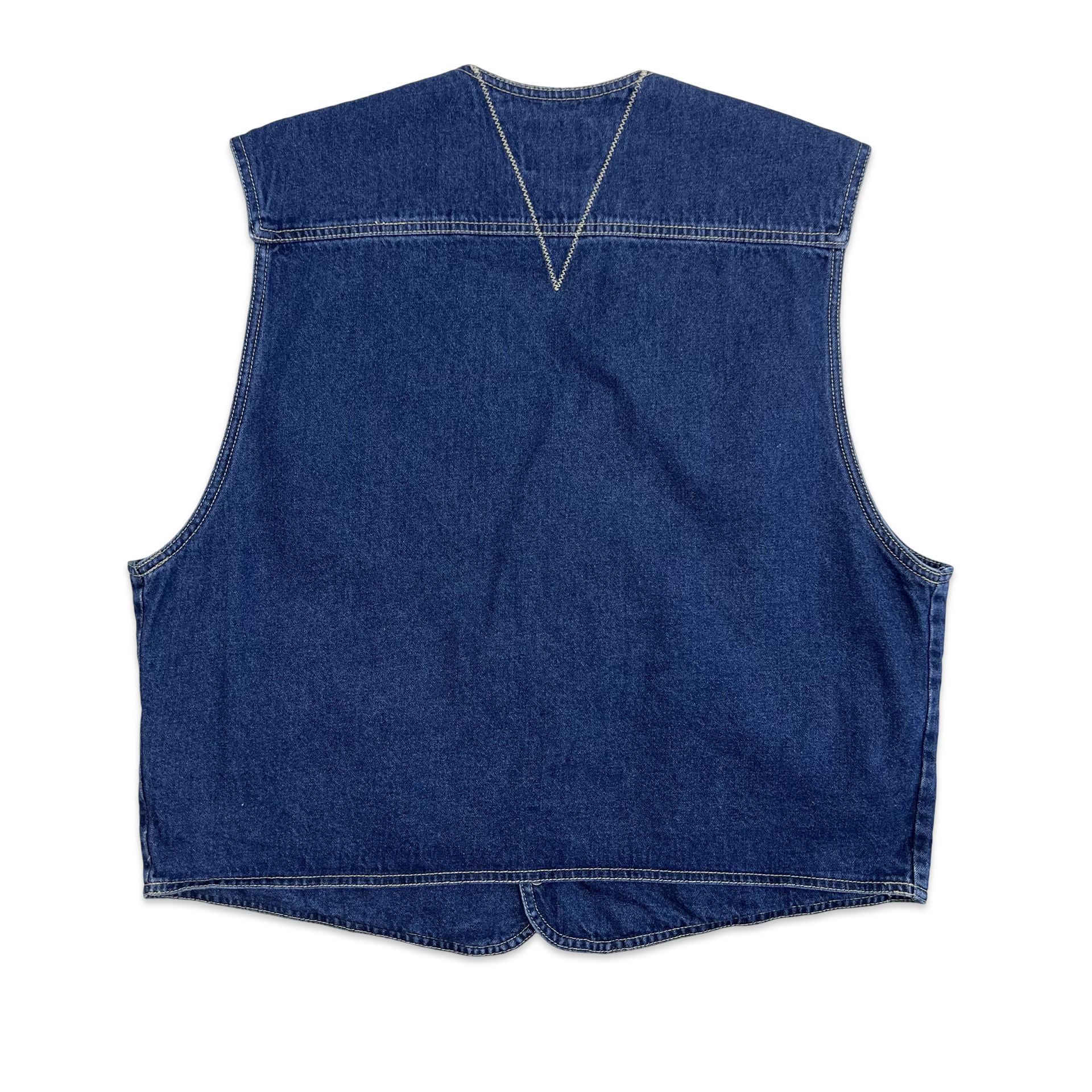Vintage 90s blue denim waistcoat gilet with multiple utility pockets.