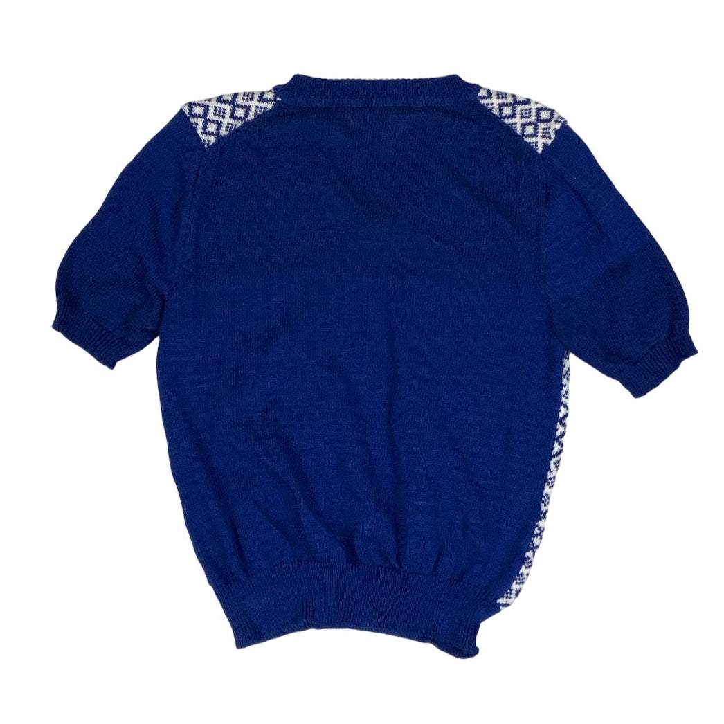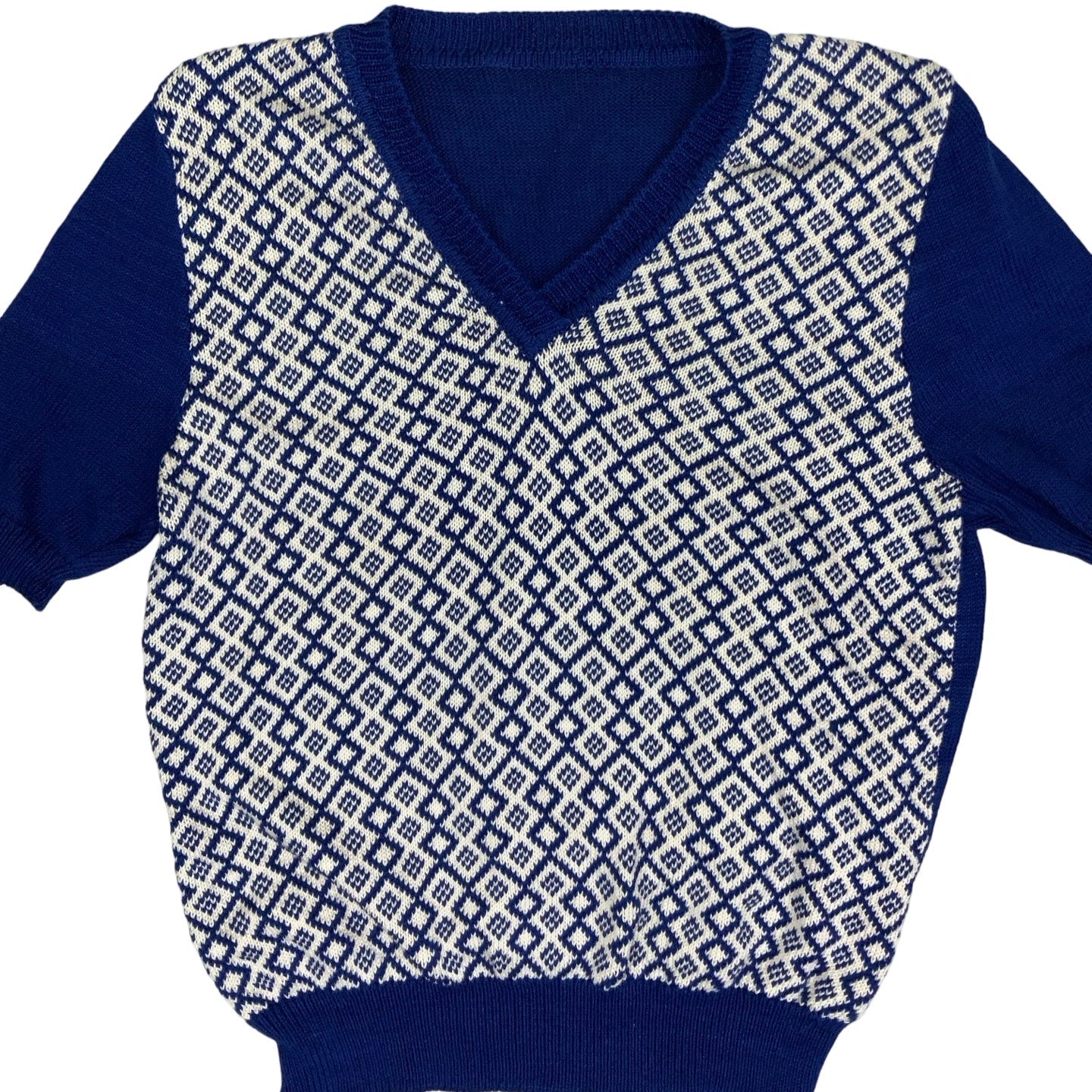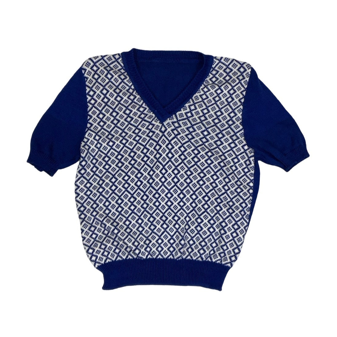 Vintage 1990s blue and white cropped v-neck knitted jumper top with short sleeves and geometric pattern at the front. Overall petite fitting with elasticated material.