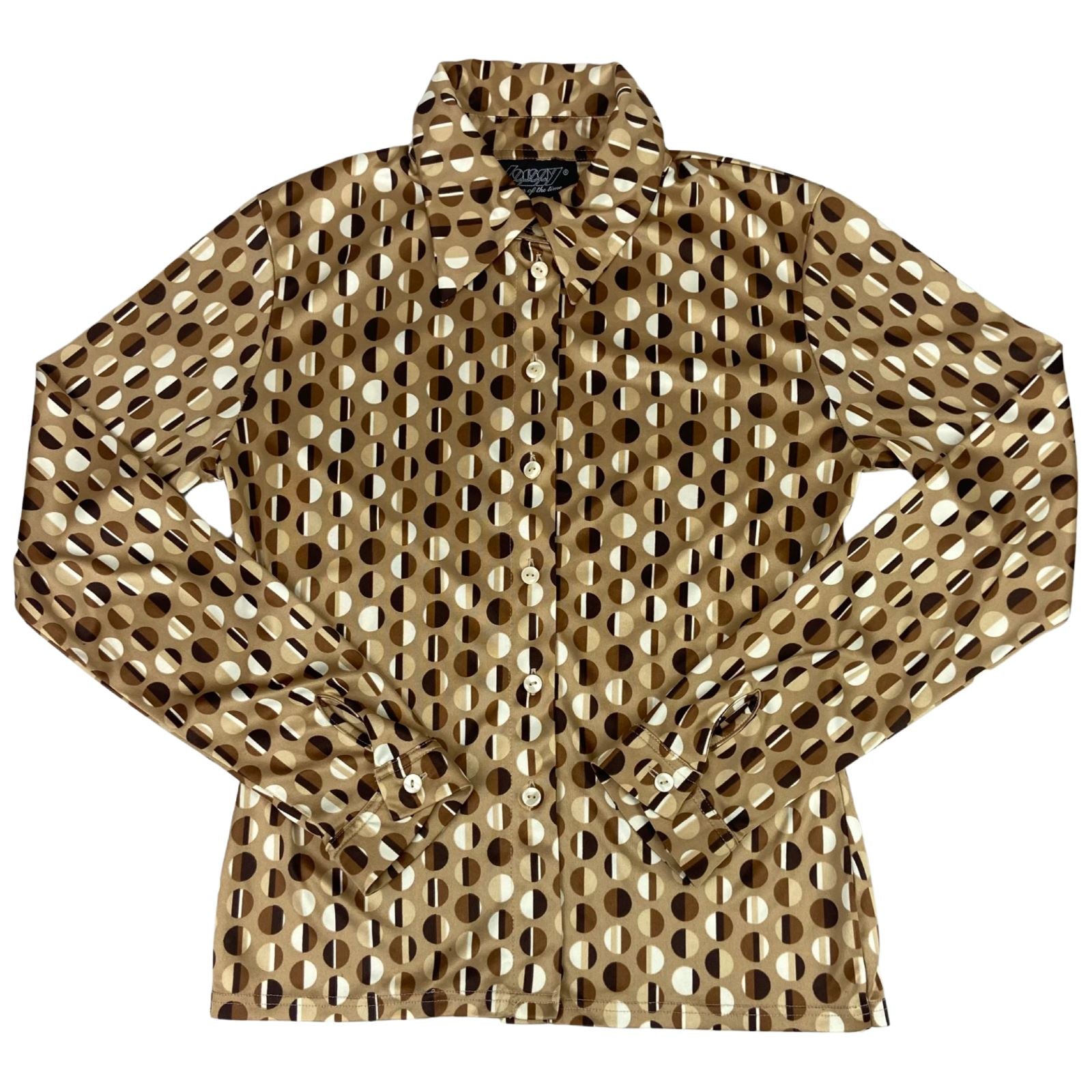 The main features include; a classic collar, a full length frontal button up fastenings, button fastening cuffs and an overall tonal brown circular geometric pattern