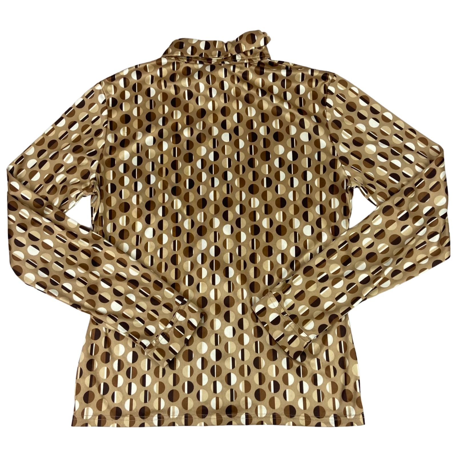 This is a lovely brown and tan Lorsay blouse, made from 100% polyester. This item has no interior lining and has a fair amount of stretch to it.