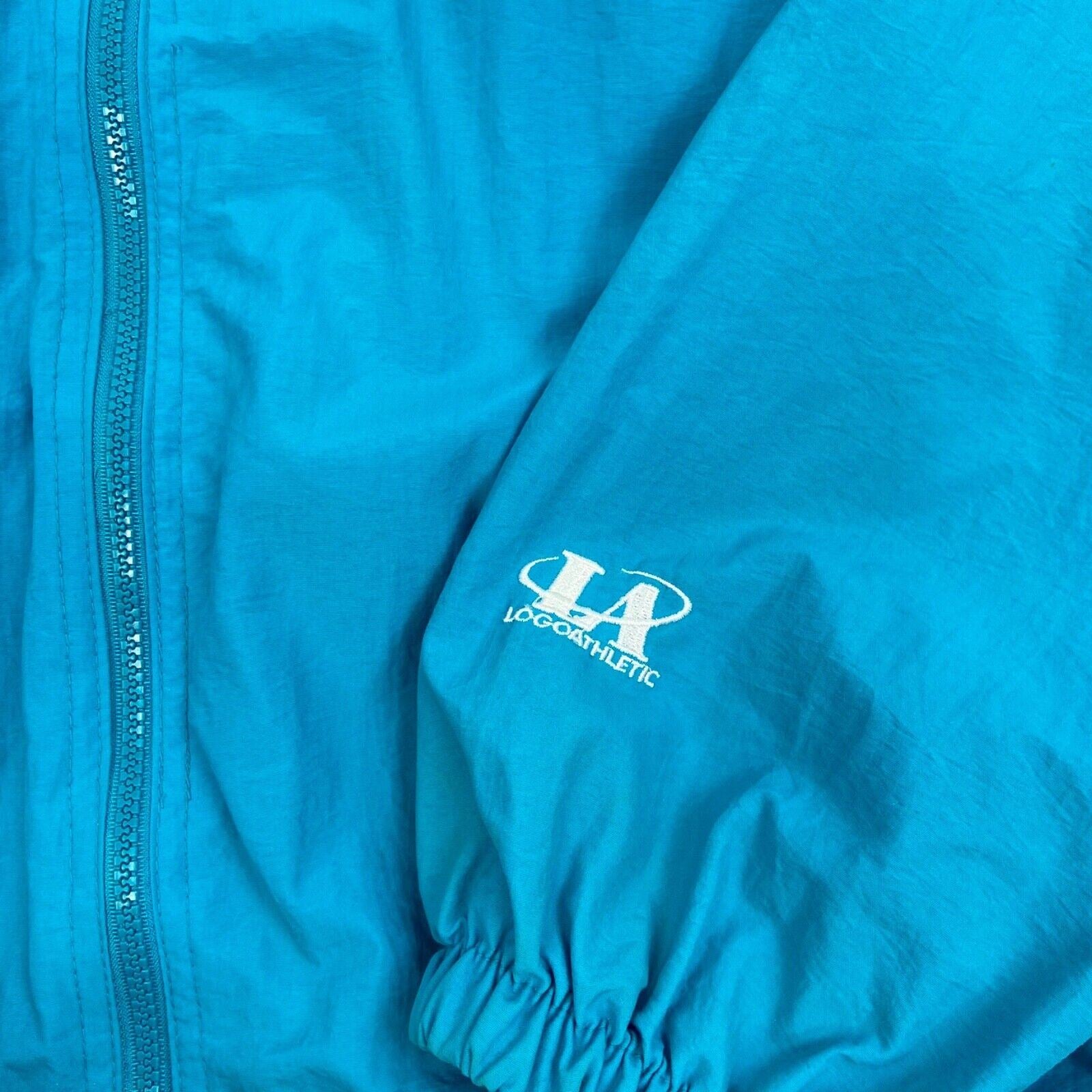 This is an amazing bright blue 90s Hornets windbreaker. This piece has a high neck and elasticated cuffs and hem. This jacket also has a purple mesh lining making it more breathable. There is a Logo Athletics branded zip and the Charlotte Hornets logo embroidered on the front of the item. The Charlotte Hornets logo is embroidered again on the back with a large spell out logo. In addition to this The Logo Athletics logo is embroidered below the neck. This piece is made to be water resistant.