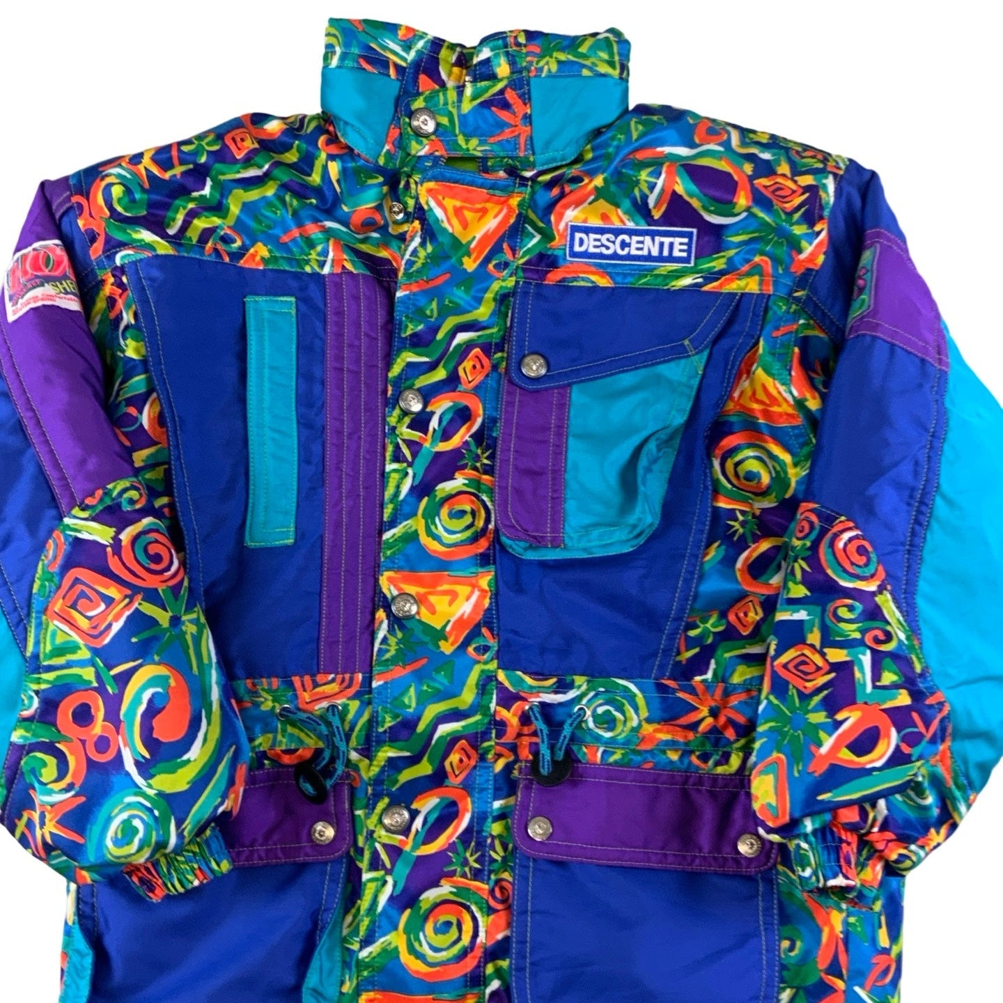 90s vintage crazy pattern Descente Multiple pocket ski jacket, zip is slightly stiff, cinches at the bottom of jacket can adjust size.