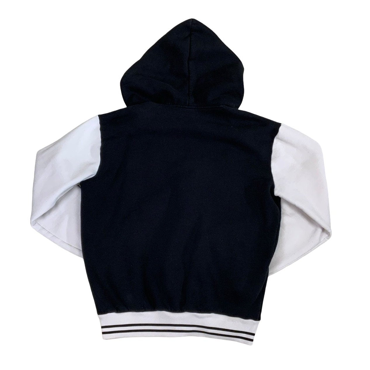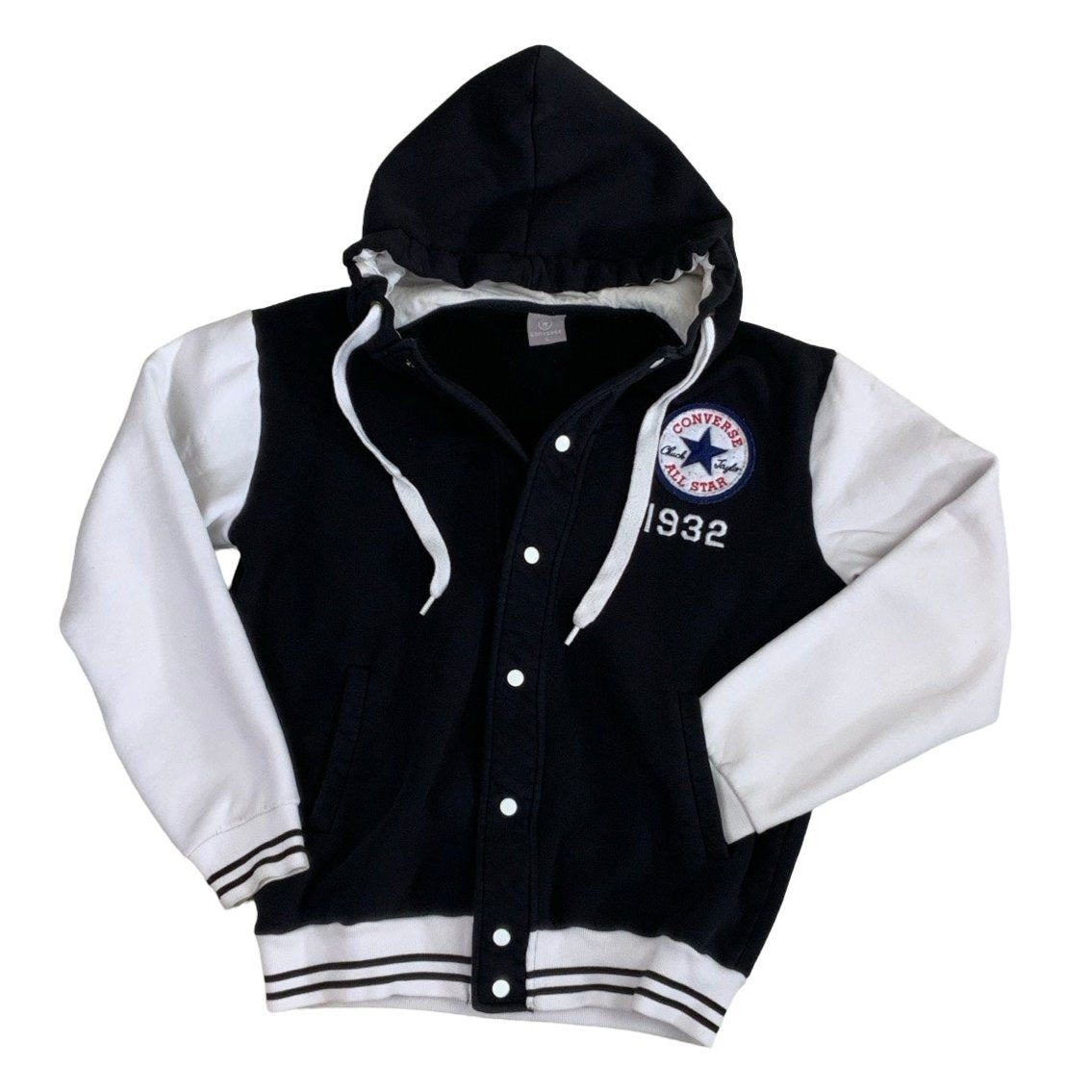 90s converse hoodie with black material on the main body, white material on the sleeves, white inlining of hood, and white elasticated waistline and cuffs with two black stripe. Embroidered converse logo on the left of the chest with the year 1932 in white. Pop button closure, and white drawstrings on the hood.
