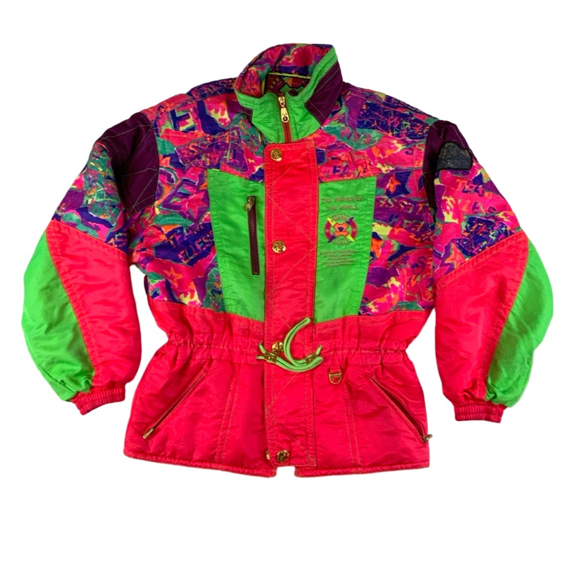 Bright 90s Ellesse colour blocked ski jacket featuring multiple pockets and zips with gold hardware, 80s style pattern.