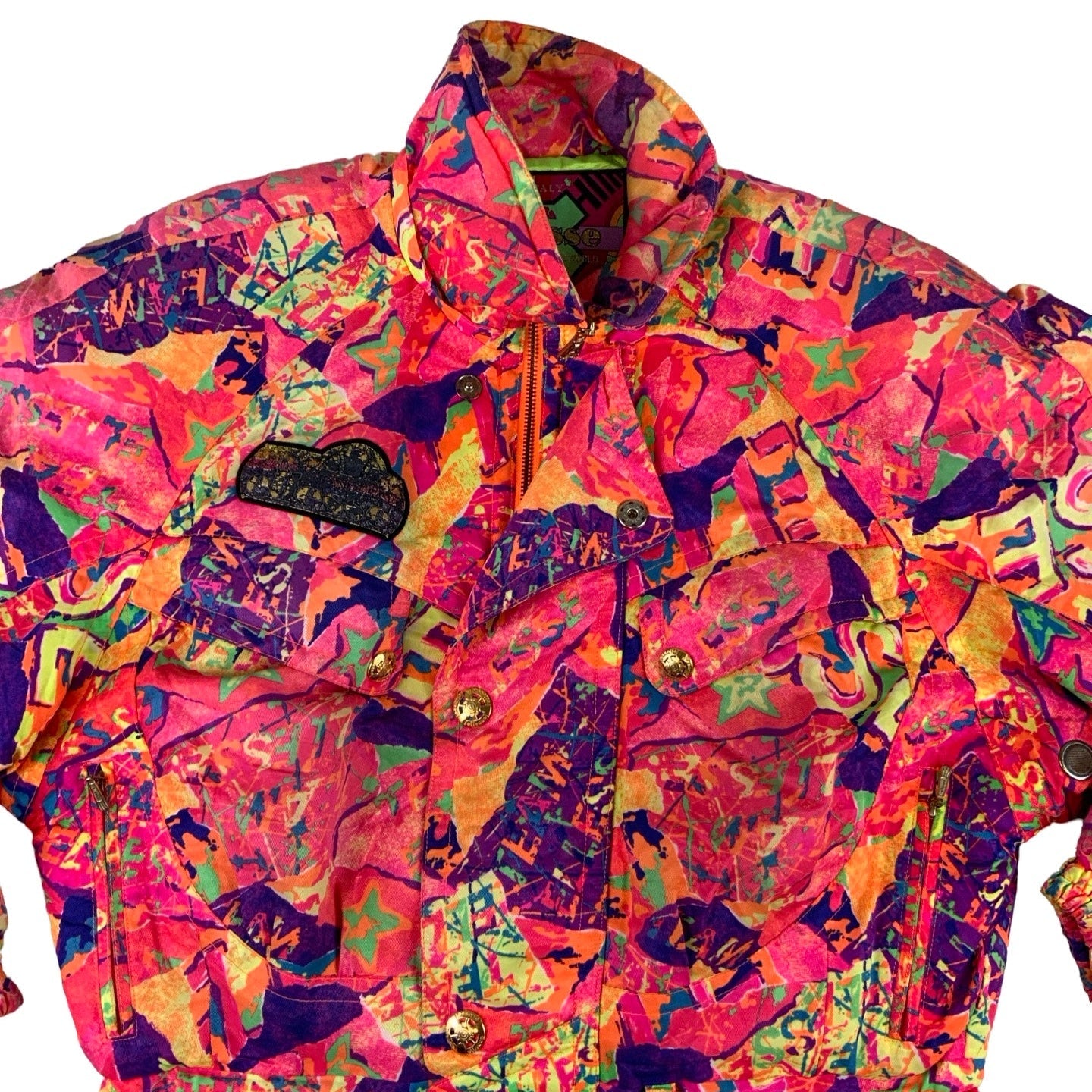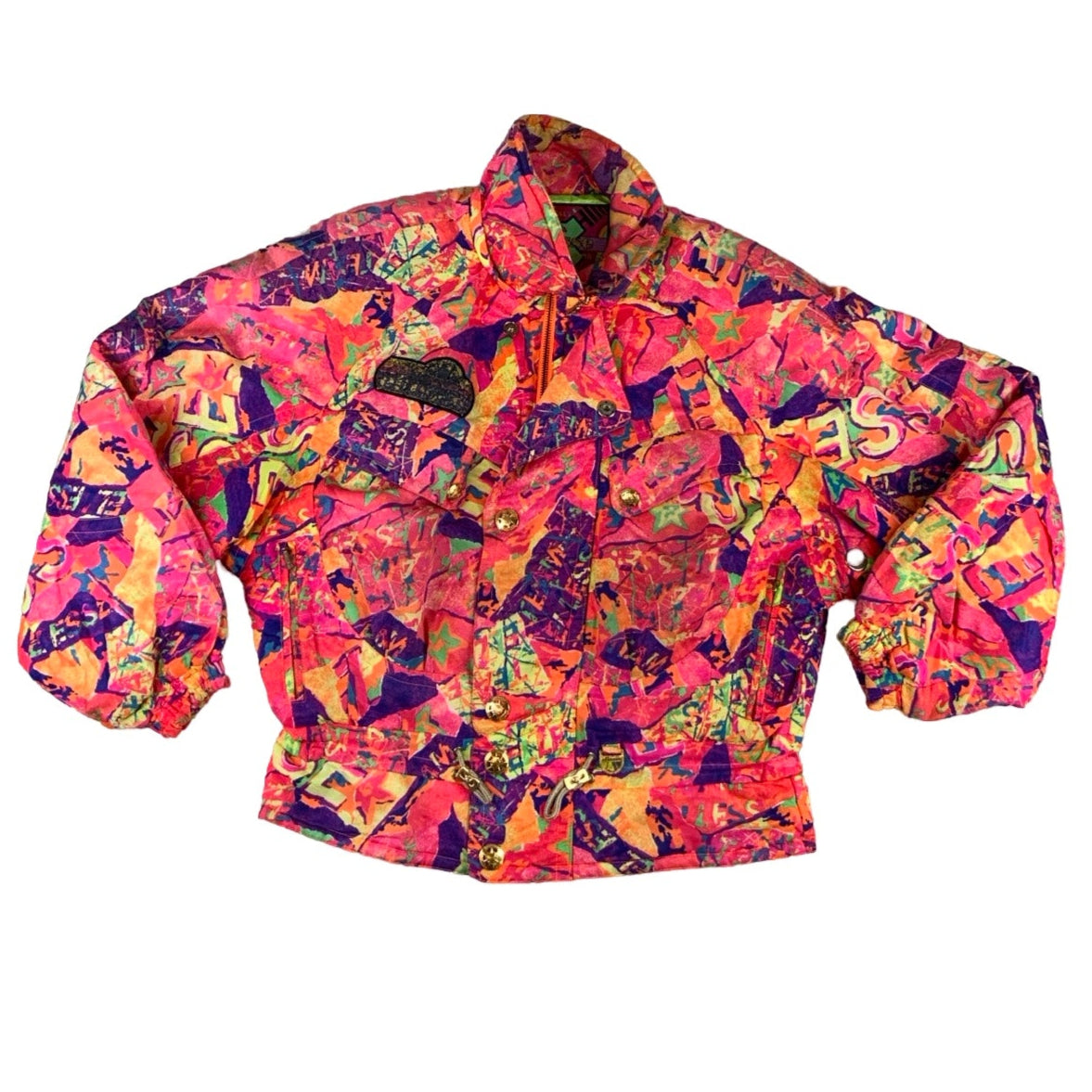 Vintage 90s Pink, purple, yellow crazy all over print pattern, featuring multiple pockets on front and side of jacket. cinch featured at bottom of the jacket