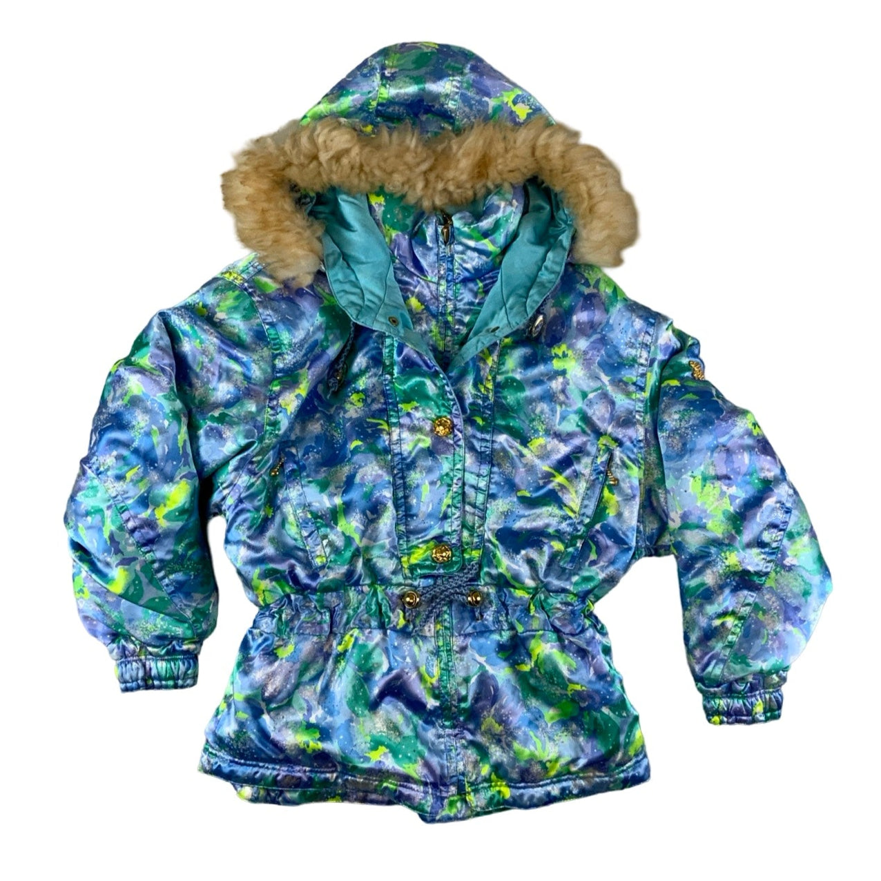 90s Vintage Ellesse blue crazy pattern faux fur trim ski jacket , drawstring waist cinch, two front zip pockets, Fully working gold zip with heart chain and popper fastening over zip for extra insulation. Jacket is a beautiful abstract patterns in blue and green with gold hardware.