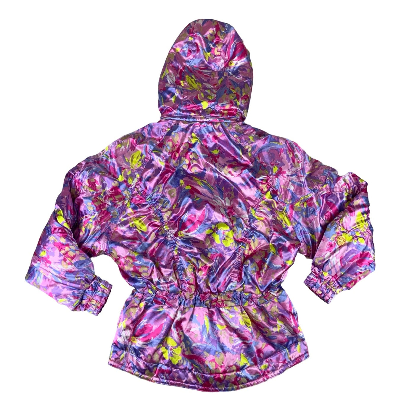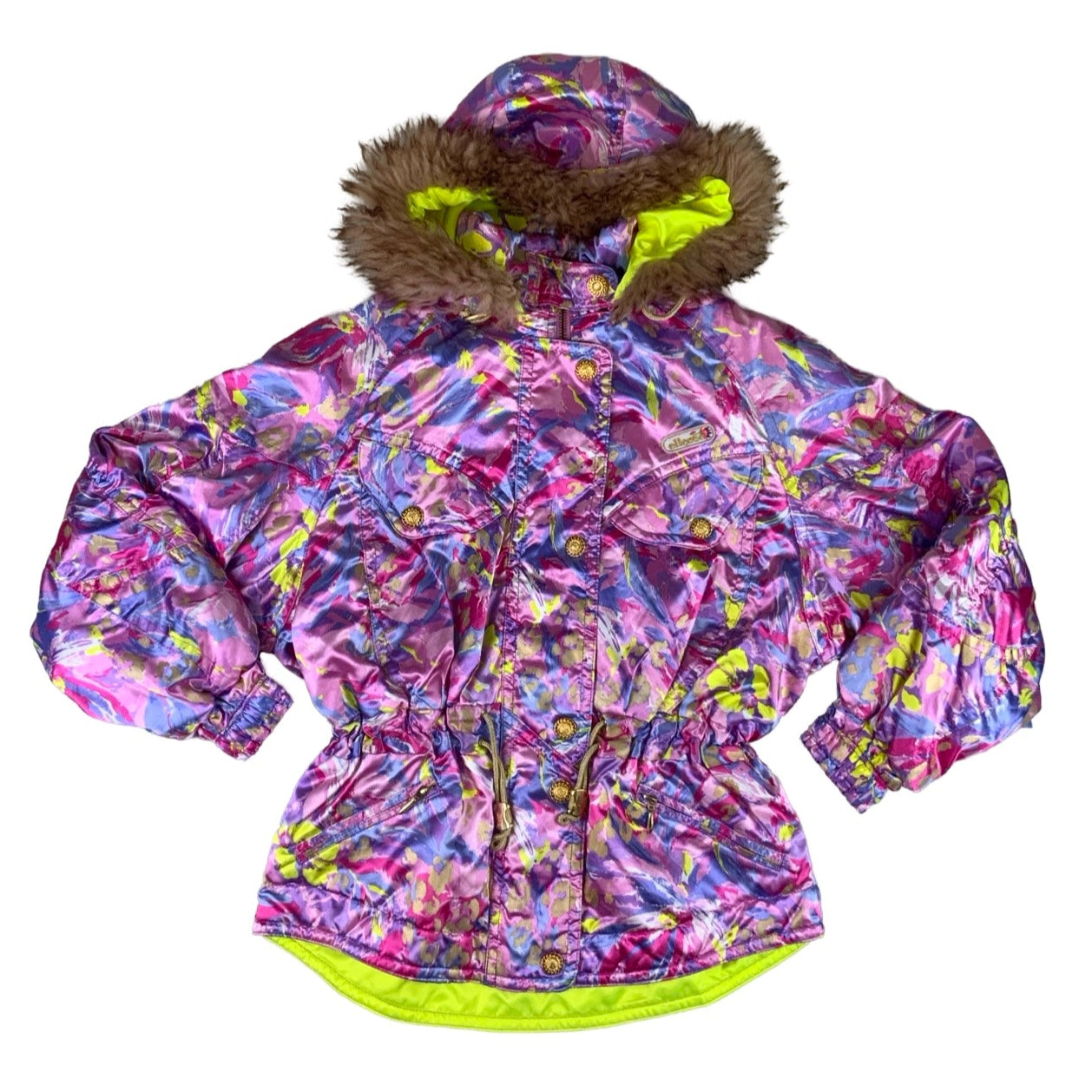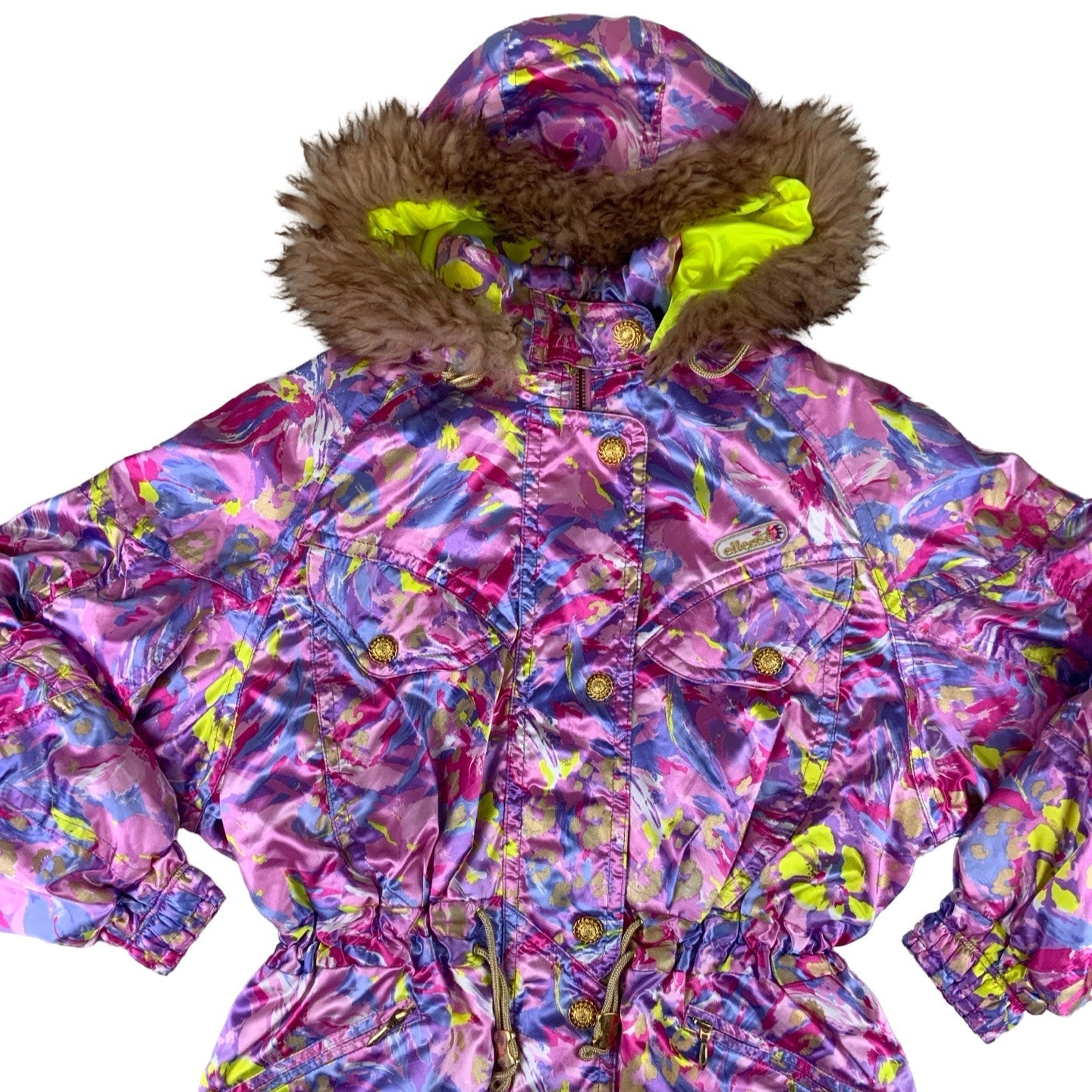 Vintage Ellesse pink, purple, yellow faux fur hooded ski jacket bright pattern, with snitched waist, bright green lining.