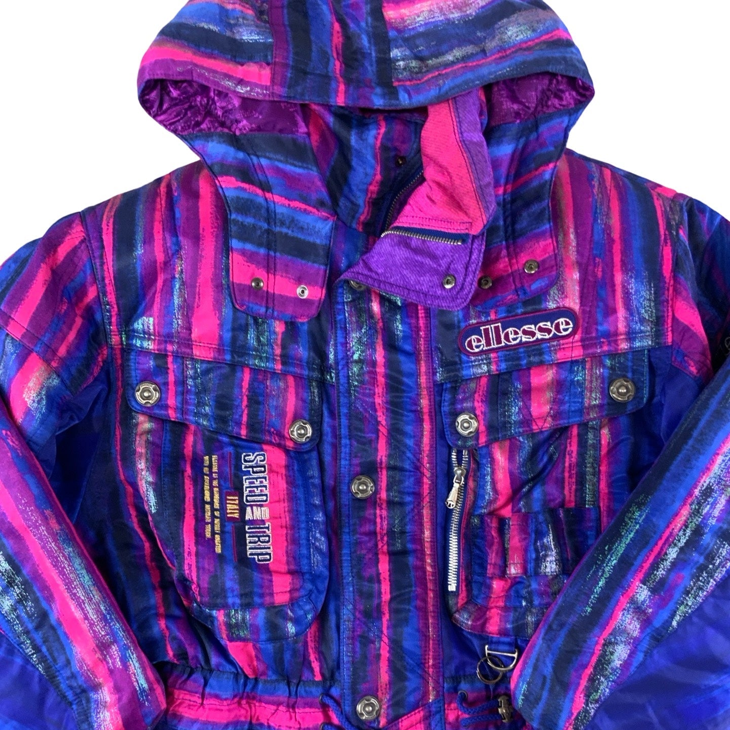 Purple and pink 90s Ellesse hooded ski jacket, featuring multiple pockets on front of jacket. waist cinch button and zip closure. Zip is slightly stiff.