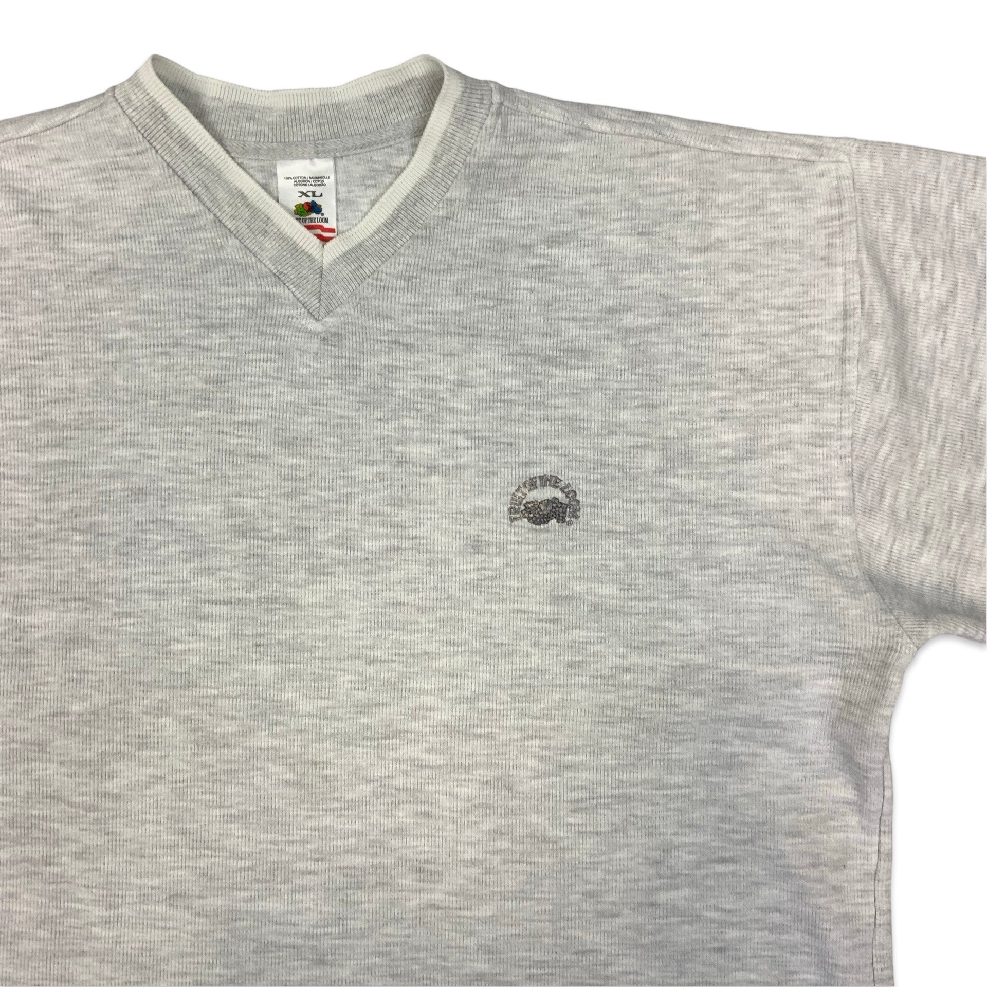 Vintage 90s Fruit of the Loom grey V-neck sweatshirt with embroidered logo on chest.