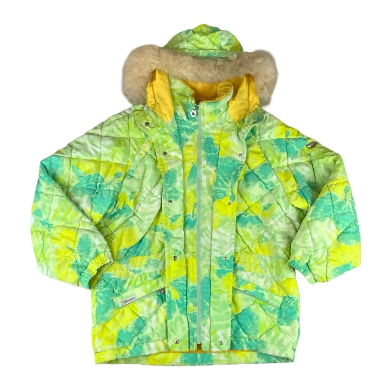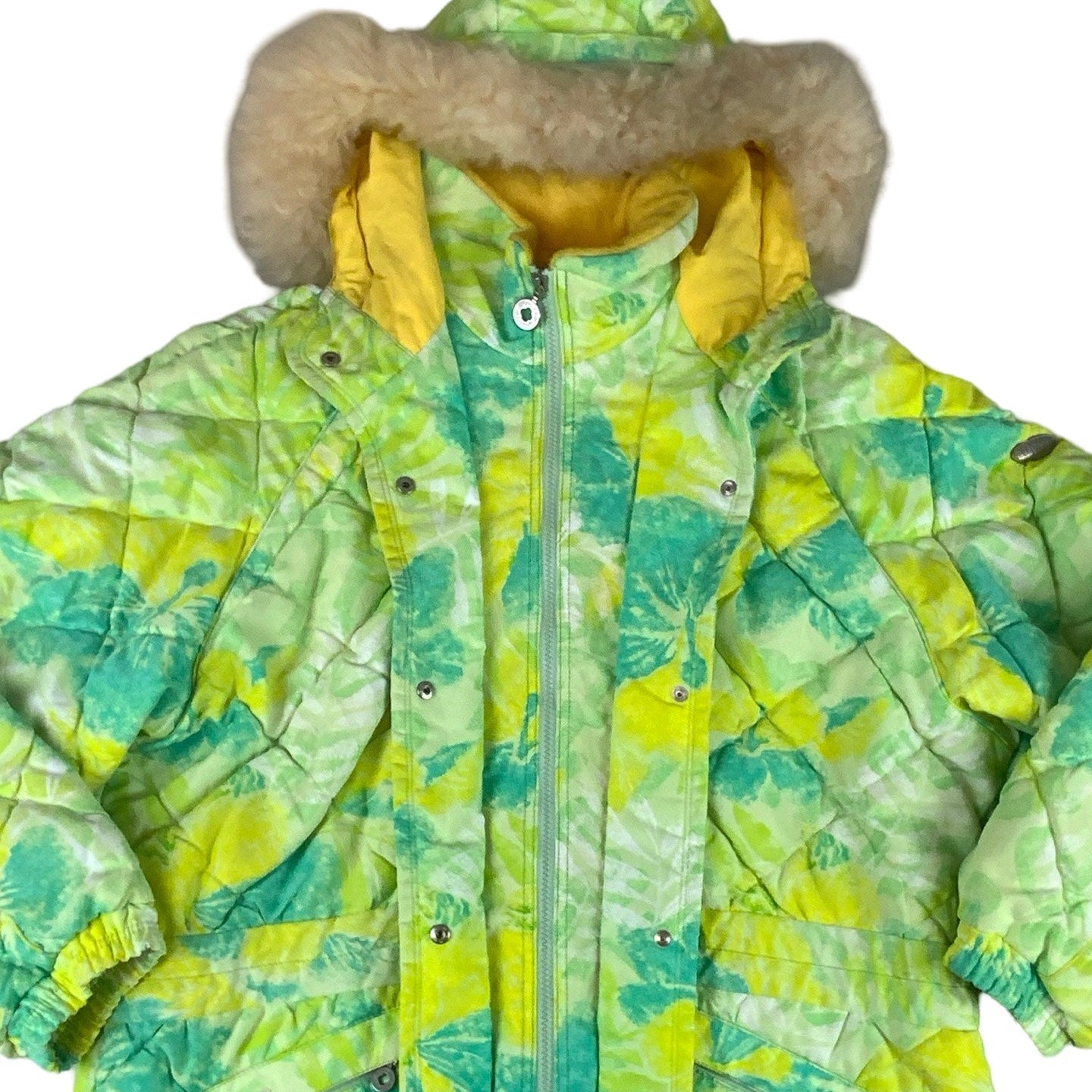 Vintage 1990s green, yellow bright pattern fur hooded retro Ellesse ski jacket.
