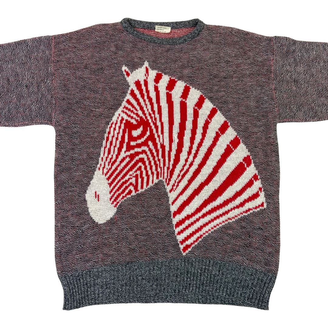 This is a fun vintage knitted jumper made from a lightweight wool blend fabric with a good amount of stretch and no additional lining. Featuring a wide round neckline, long fitted sleeves and a longline fit. Covering the grey and red speckled fabric is a large zebra graphic in white and red.