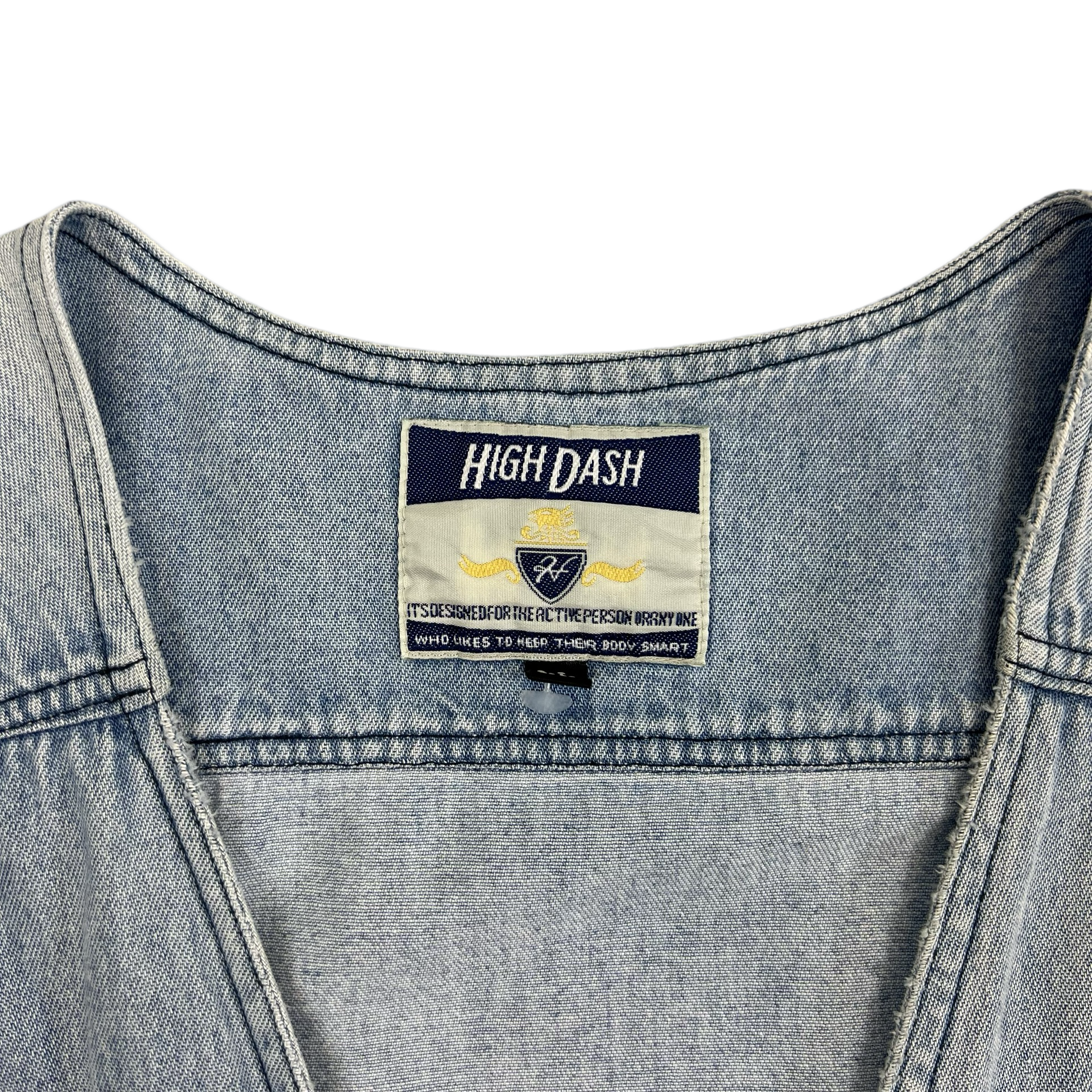 Vintage 90s blue denim waistcoat gilet with multiple utility pockets.