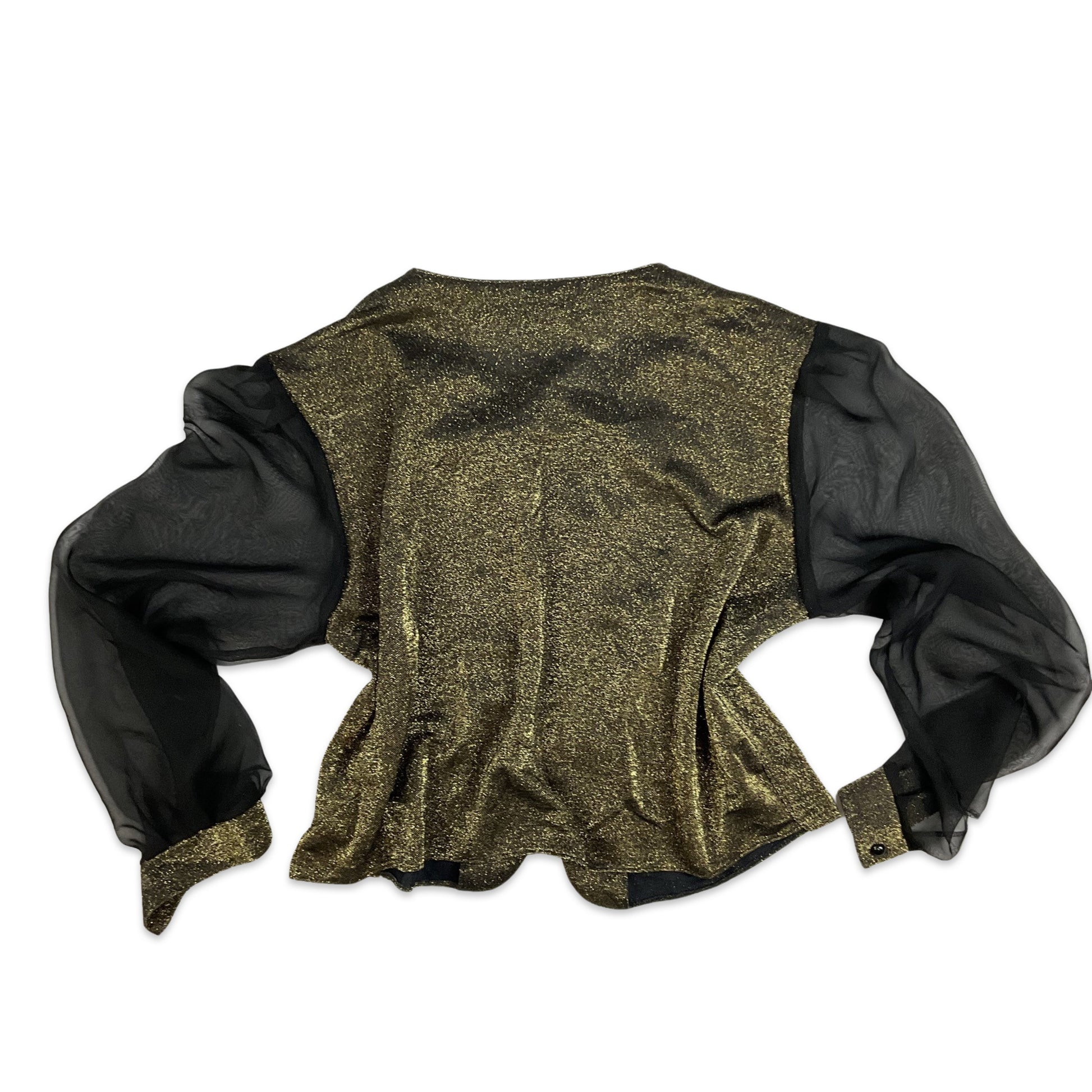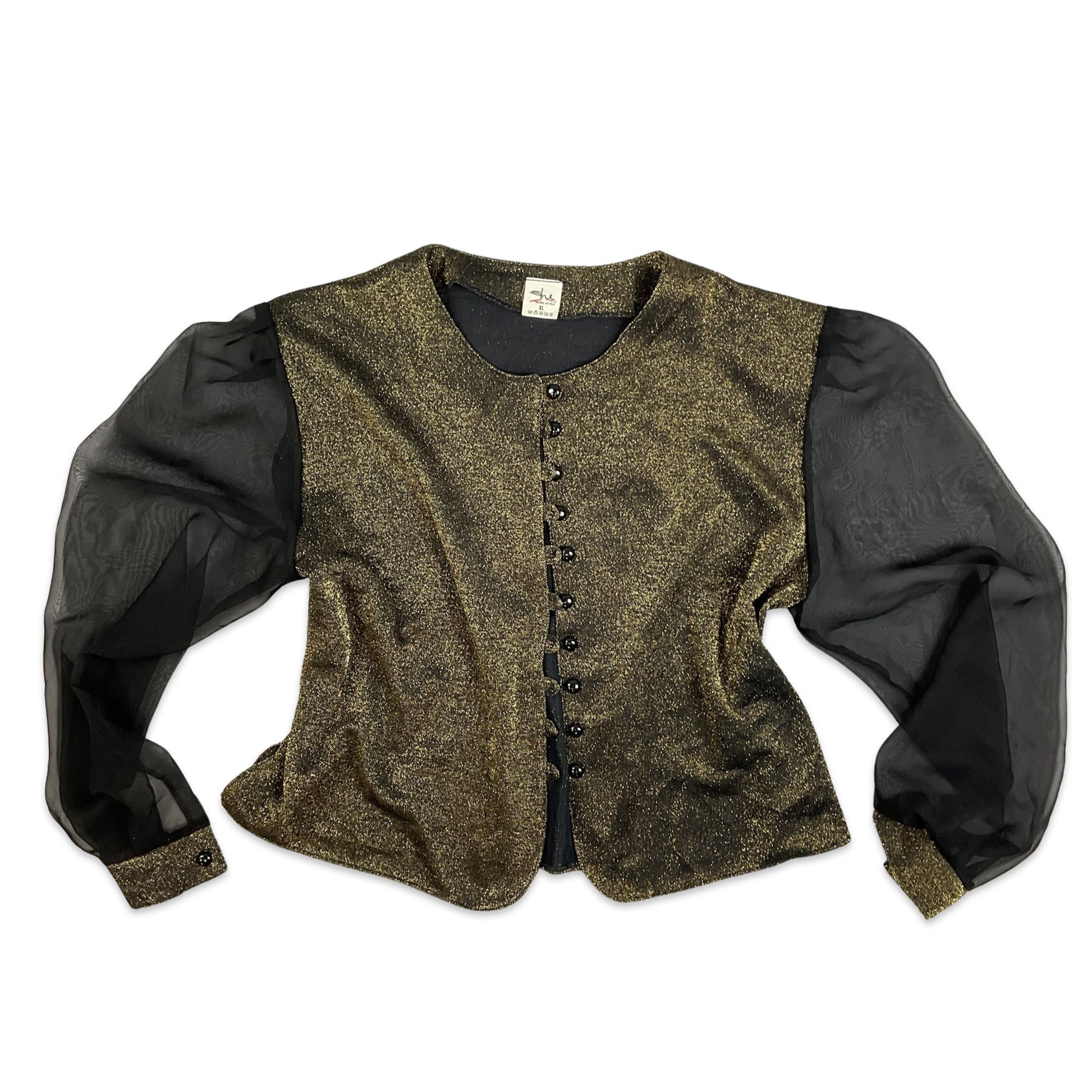 Vintage 90s does 70s Lurex blouse, gold Lurex sparkly thread bodice, sheer black balloon sleeves, gold cuffs. Button fastening, round neckline, box silhouette. Nylon material, has some stretch.