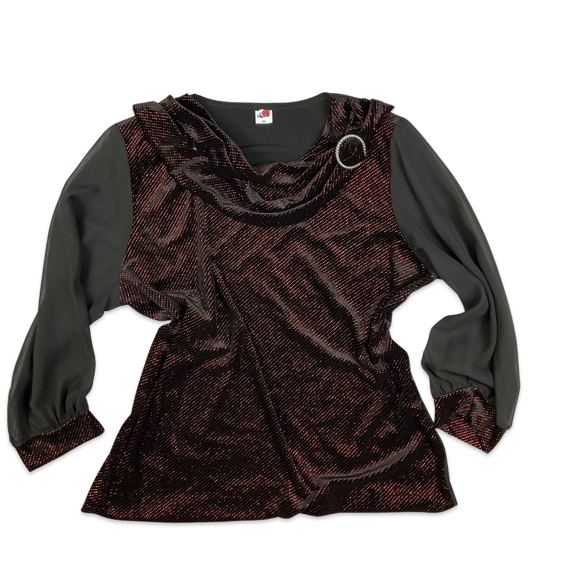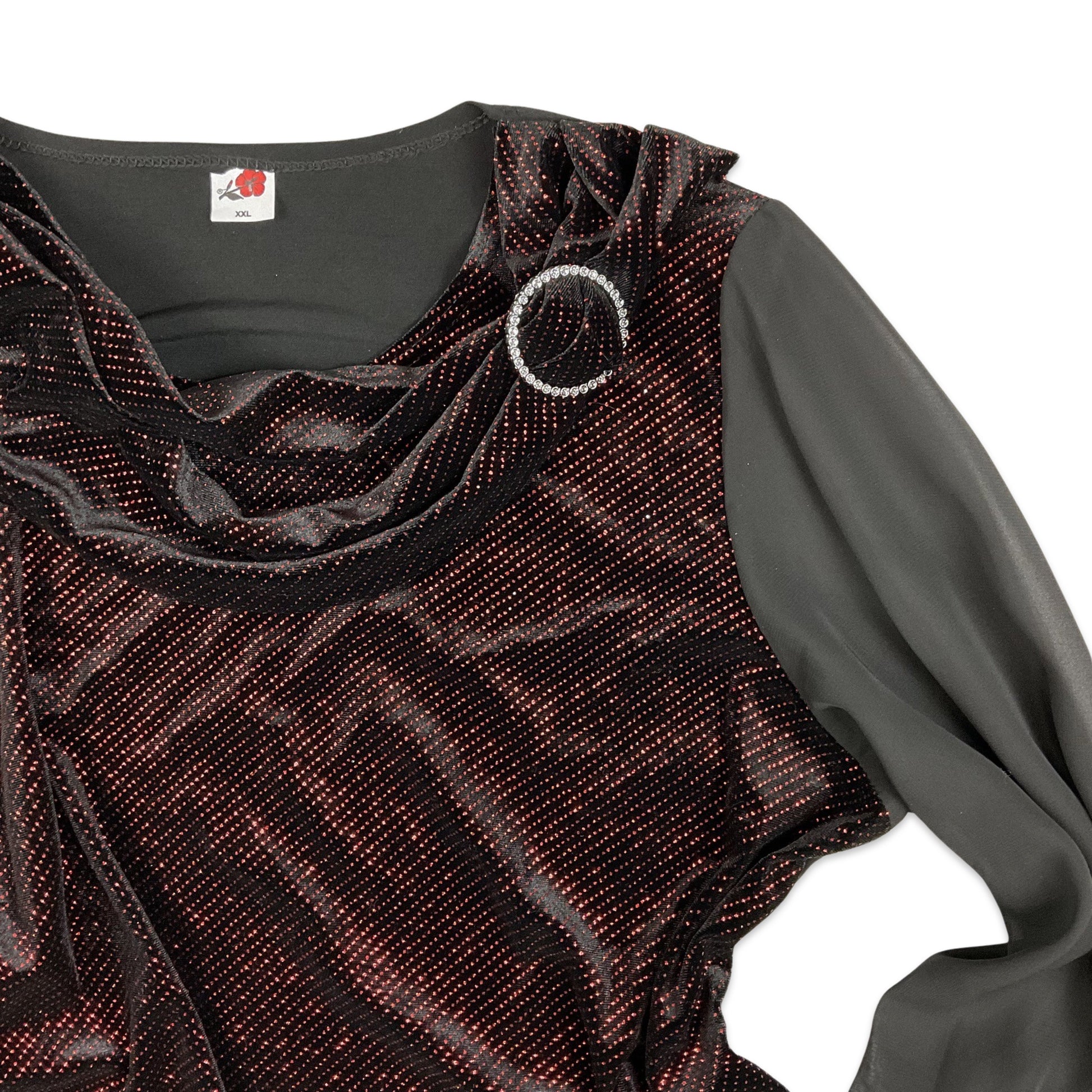 Vintage 90s Y2K black and red lurex metallic top. Cowl neck, sheer black balloon sleeves, oversized fit. Silver diamanté buckle detail.