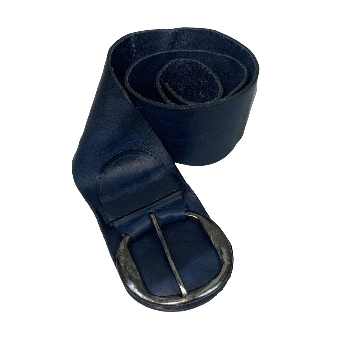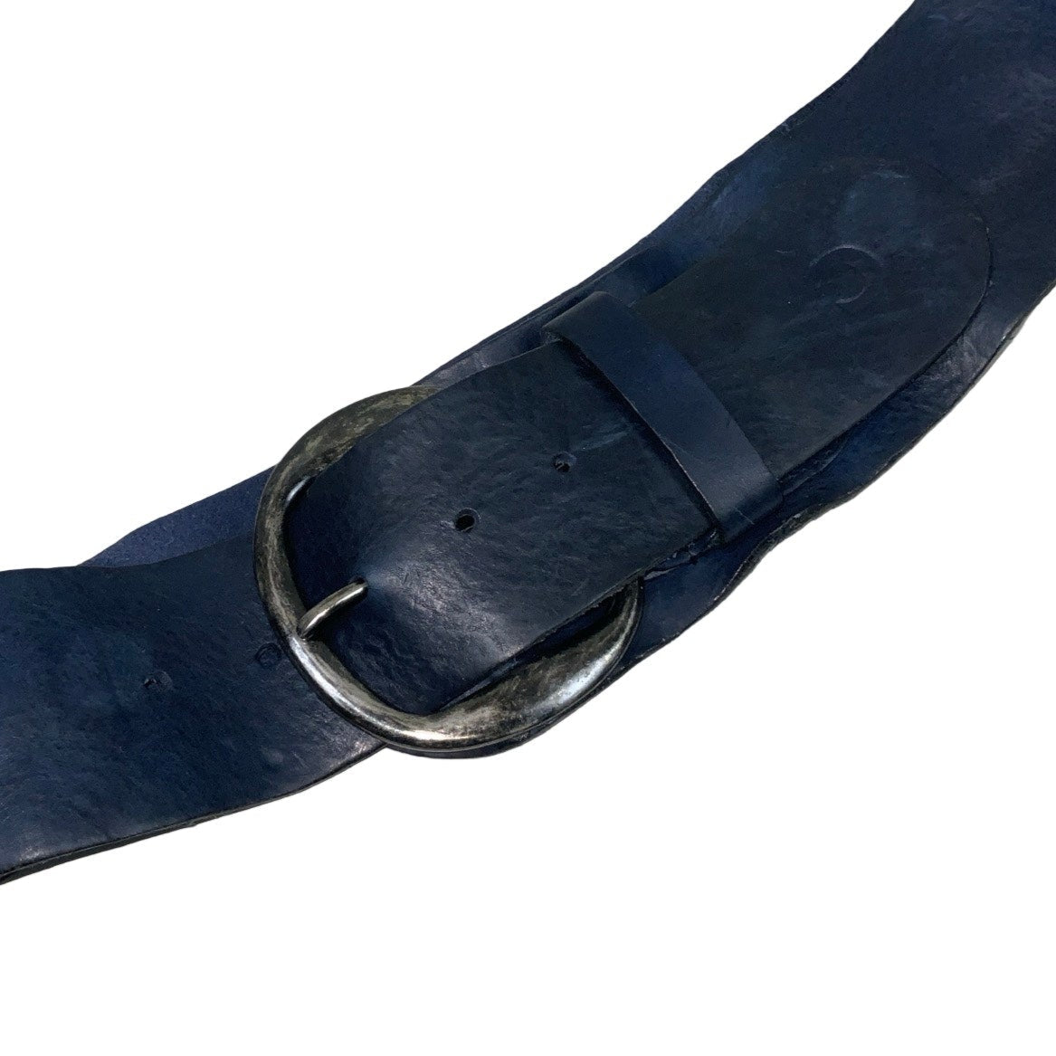Vintage 1990s Moscow brand blue soft suede leather low waist belt with a distressed silver prong buckle fastening.