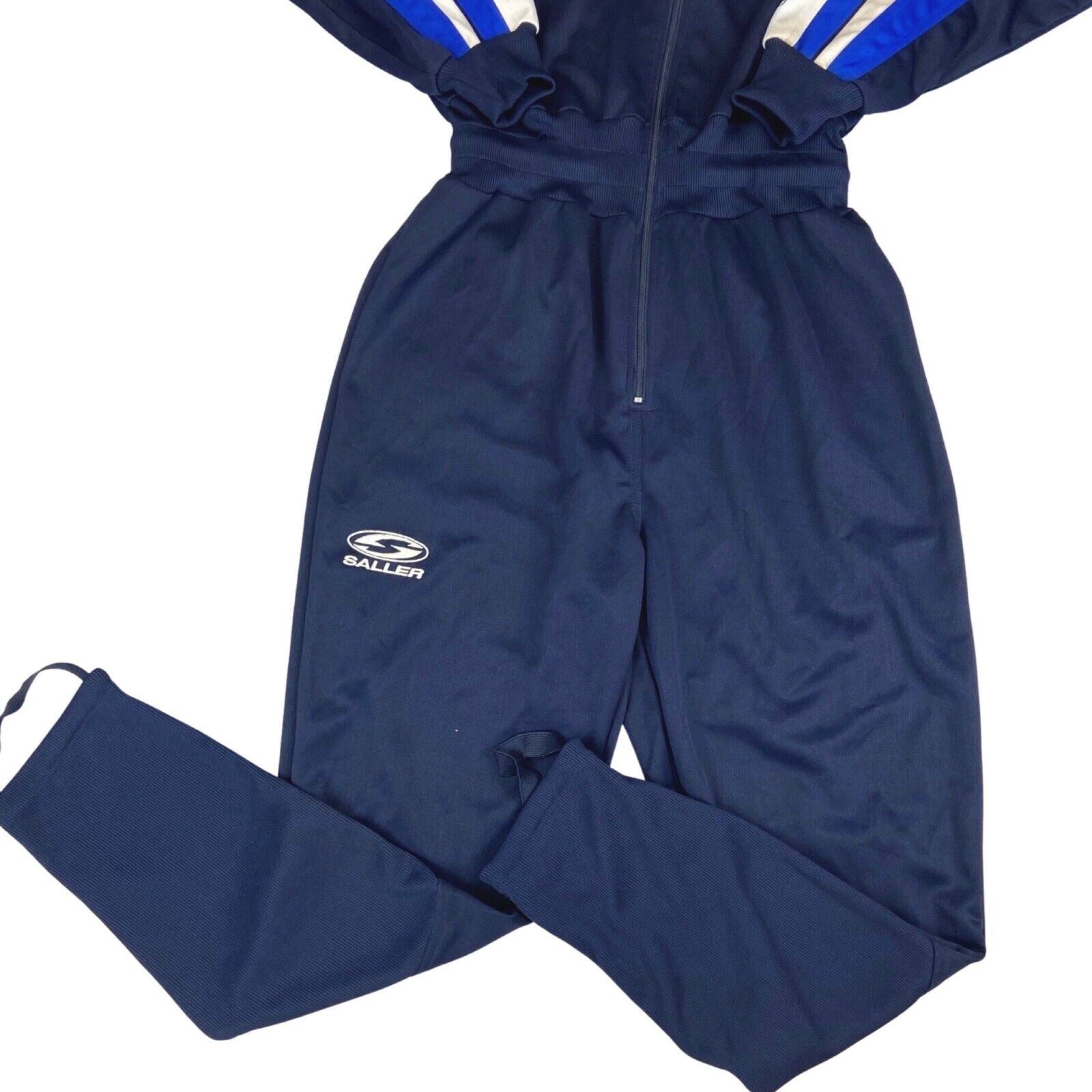 The main features on this include; full length front zip, blue and white panels running from the collar down to the sleeve cuffs, elasticated ribbed waistband, ribbed arm, white embroidered Saller logo and spell-out on the right chest and leg, navy embroidered Saller spell-out on the left sleeve, ribbed panels on the back of the calf down to the hem at the ankle and elastic stirrups at the ankle.