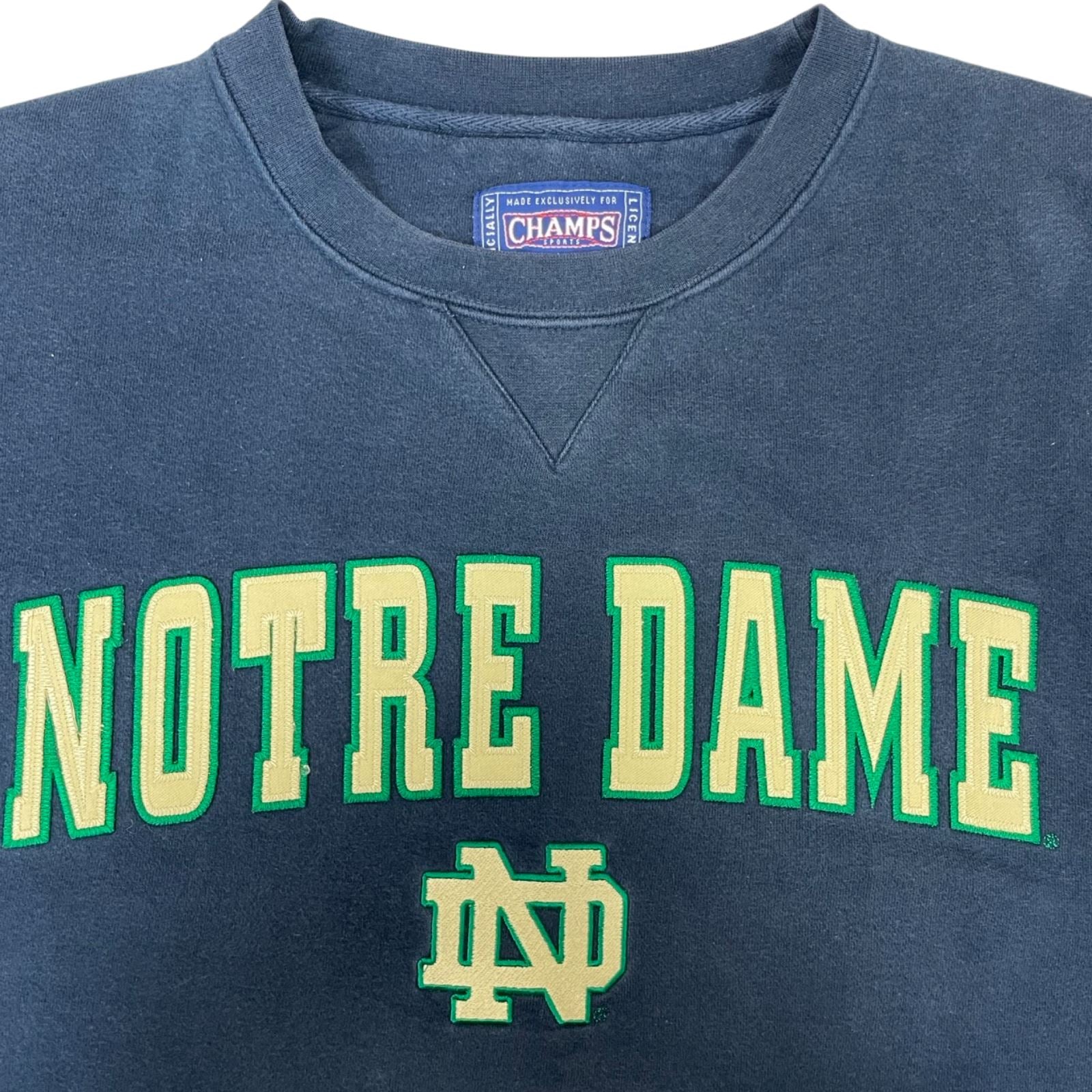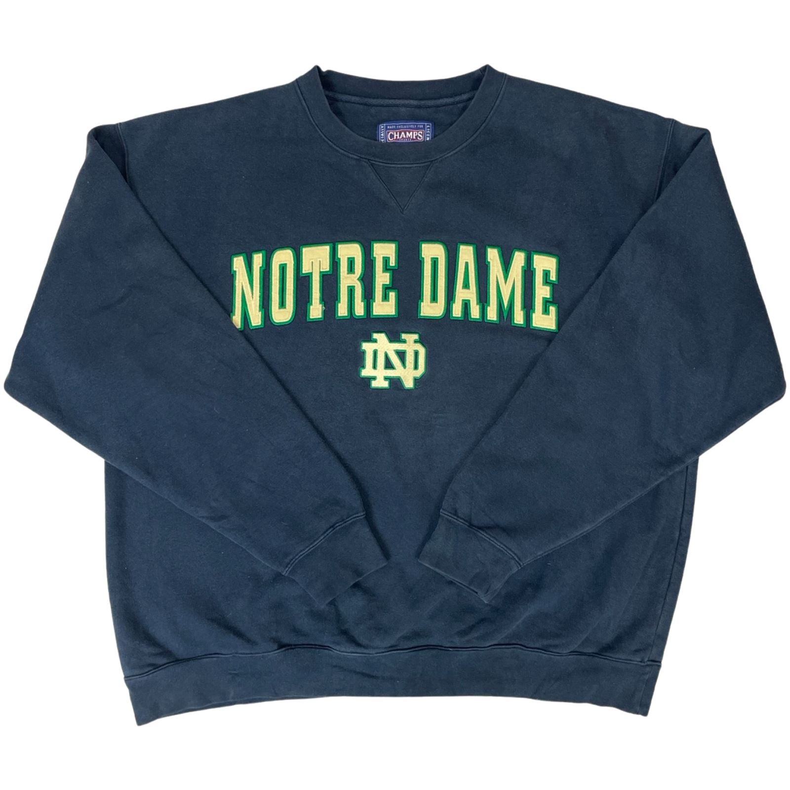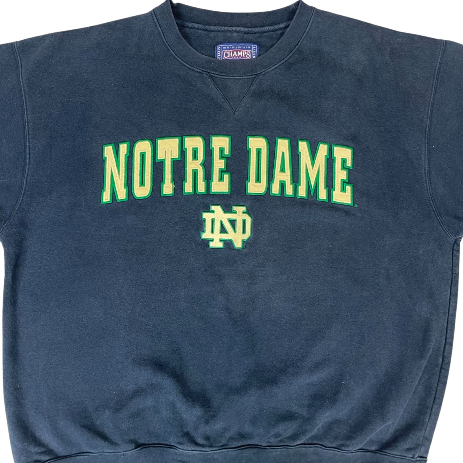The main features include; A crew neckline, ribbed knit cuffs, a large front appliqué green and yellow "Notre Dame" spell-out, a green and yellow embroidered logo.