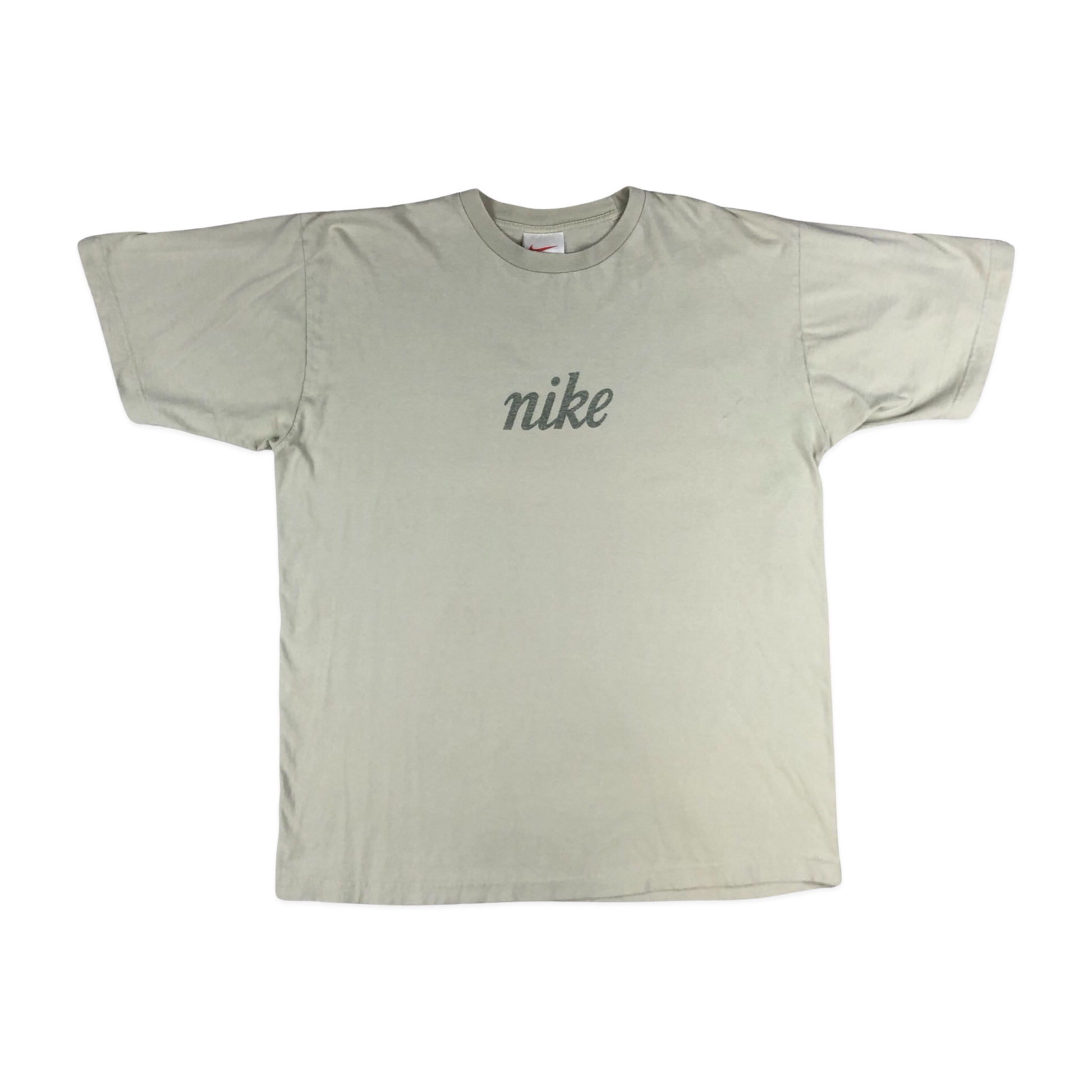 Vintage 90s Nike beige tee with lowercase printed spell out across front in brown.