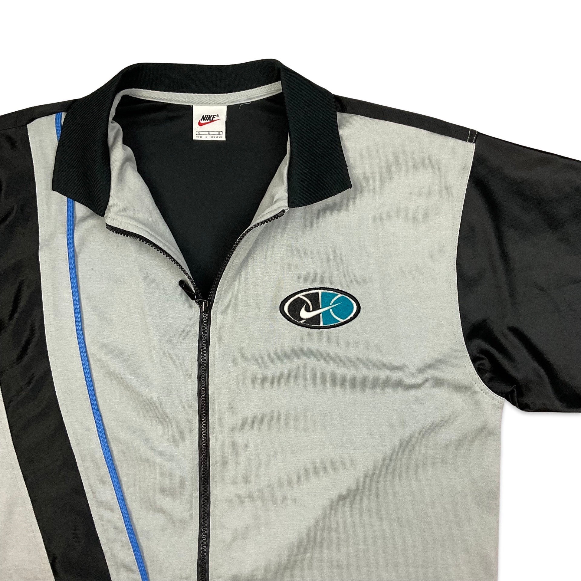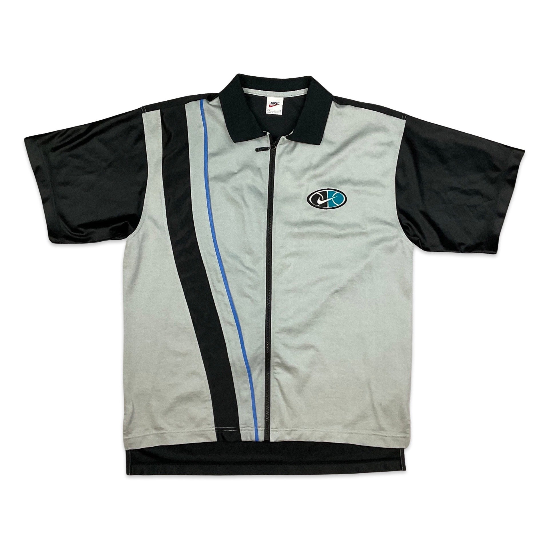 Vintage 90s Nike zip-up shirt style basketball jersey in silver and black with blue accents.