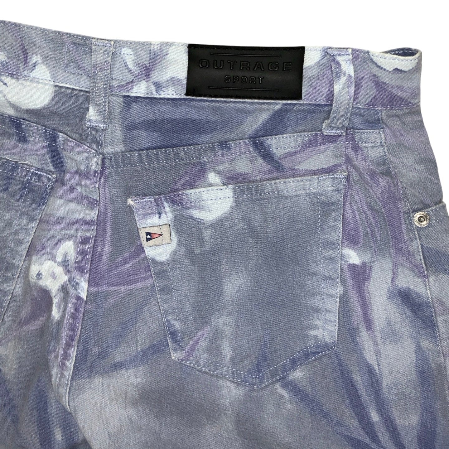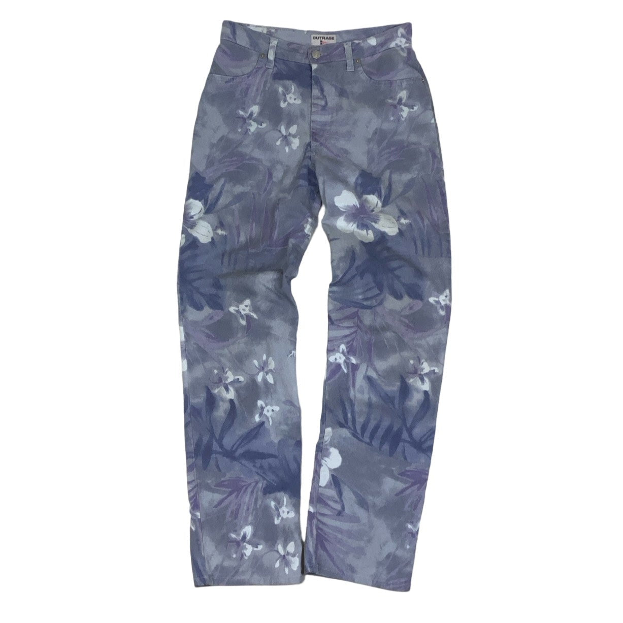 Vintage 1990s Outrage Sport wide leg jeans in a faded purple and white colour with floral designs. Front fly fastening, side pockets and bum pockets.