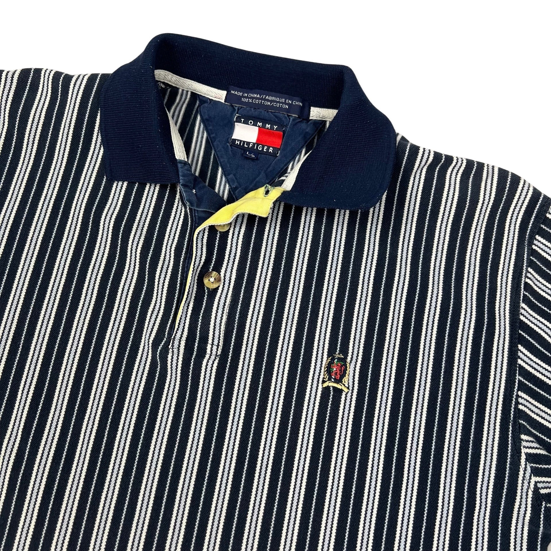 Vintage 90s Tommy Hilfiger polo shirt with stripe pattern throughout and small embroidered crest logo.