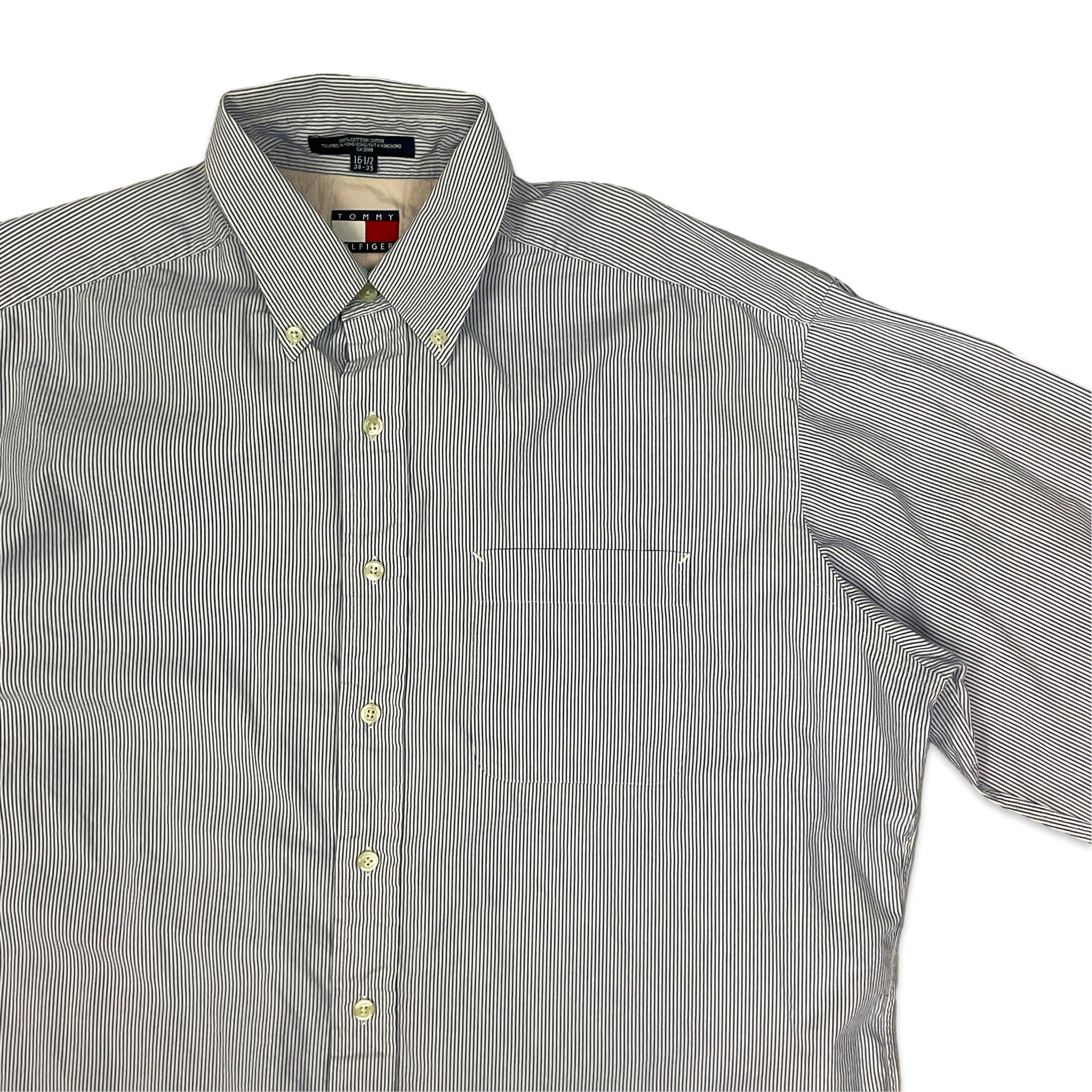 Vintage 1990s Tommy Hilfiger button-up shirt with all-over blue and white stripe print and chest pocket.