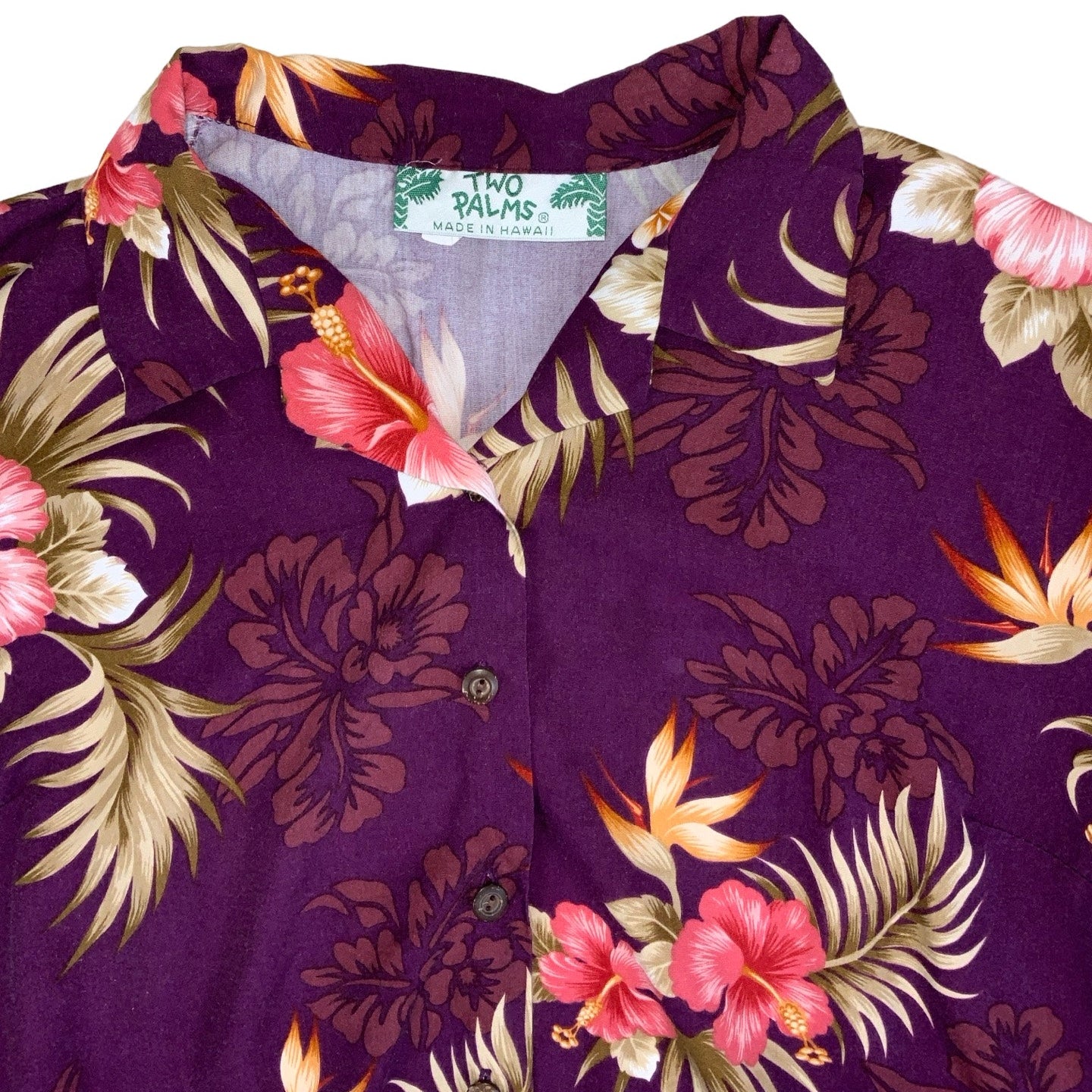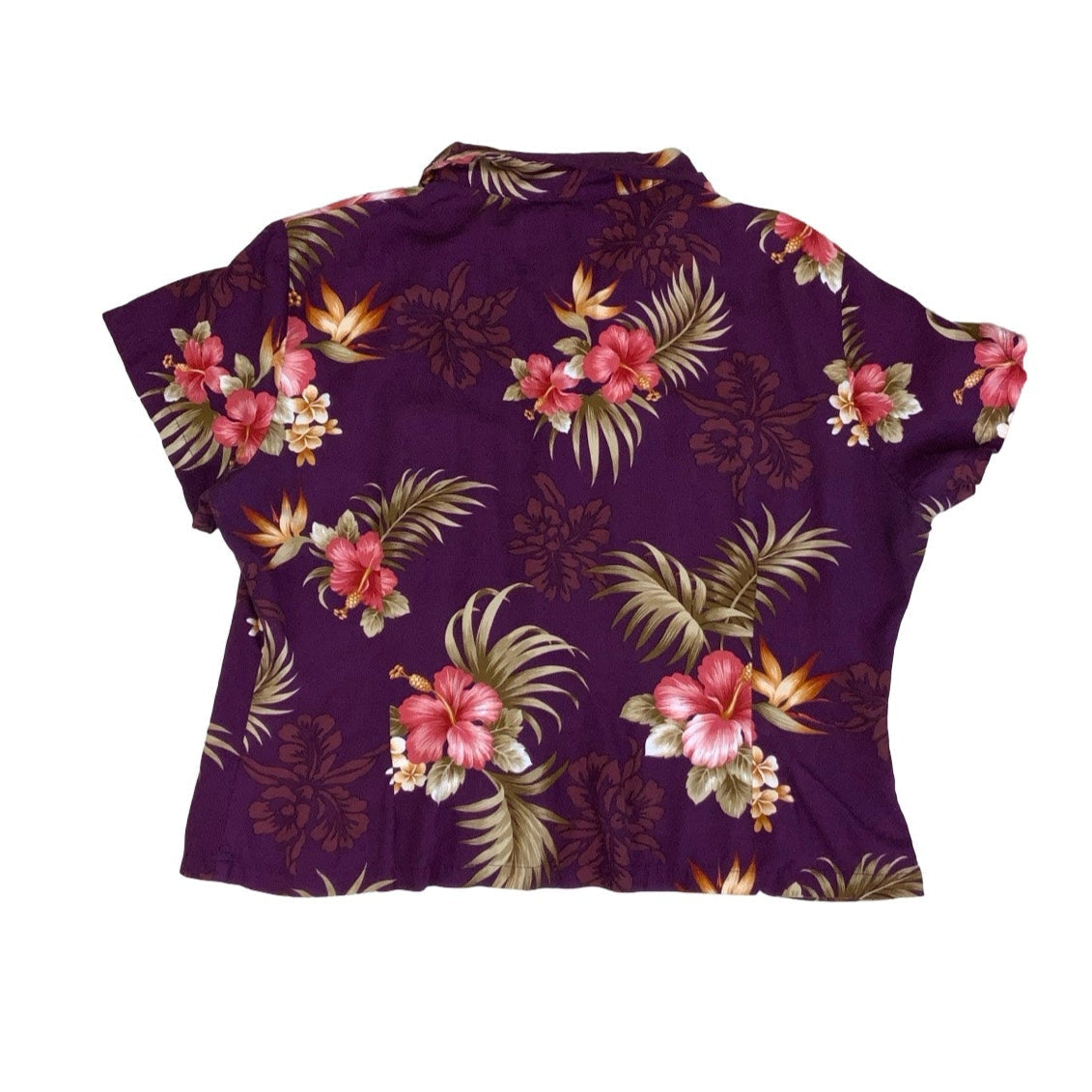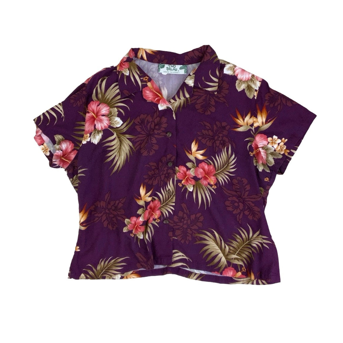 Vintage 1990s Two Palms Hawaiian purple floral short sleeves crop blouse with a button down fastening and a camp collar neckline. 100% rayon.
